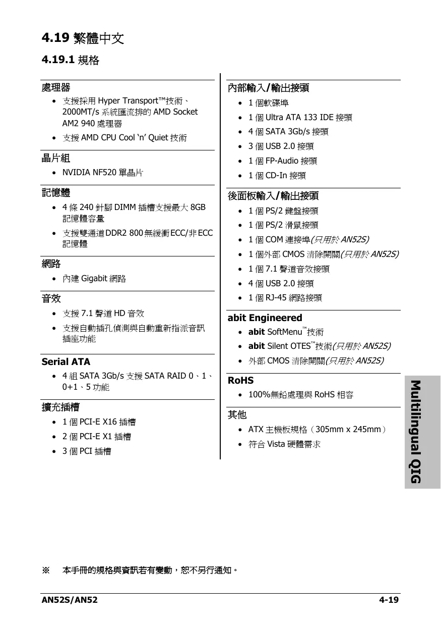- 符合 Vista 硬體需求 本手冊的規格與資訊若有變動,恕不另行通知。 AN52S/AN52 4-19 Multilingual QIG