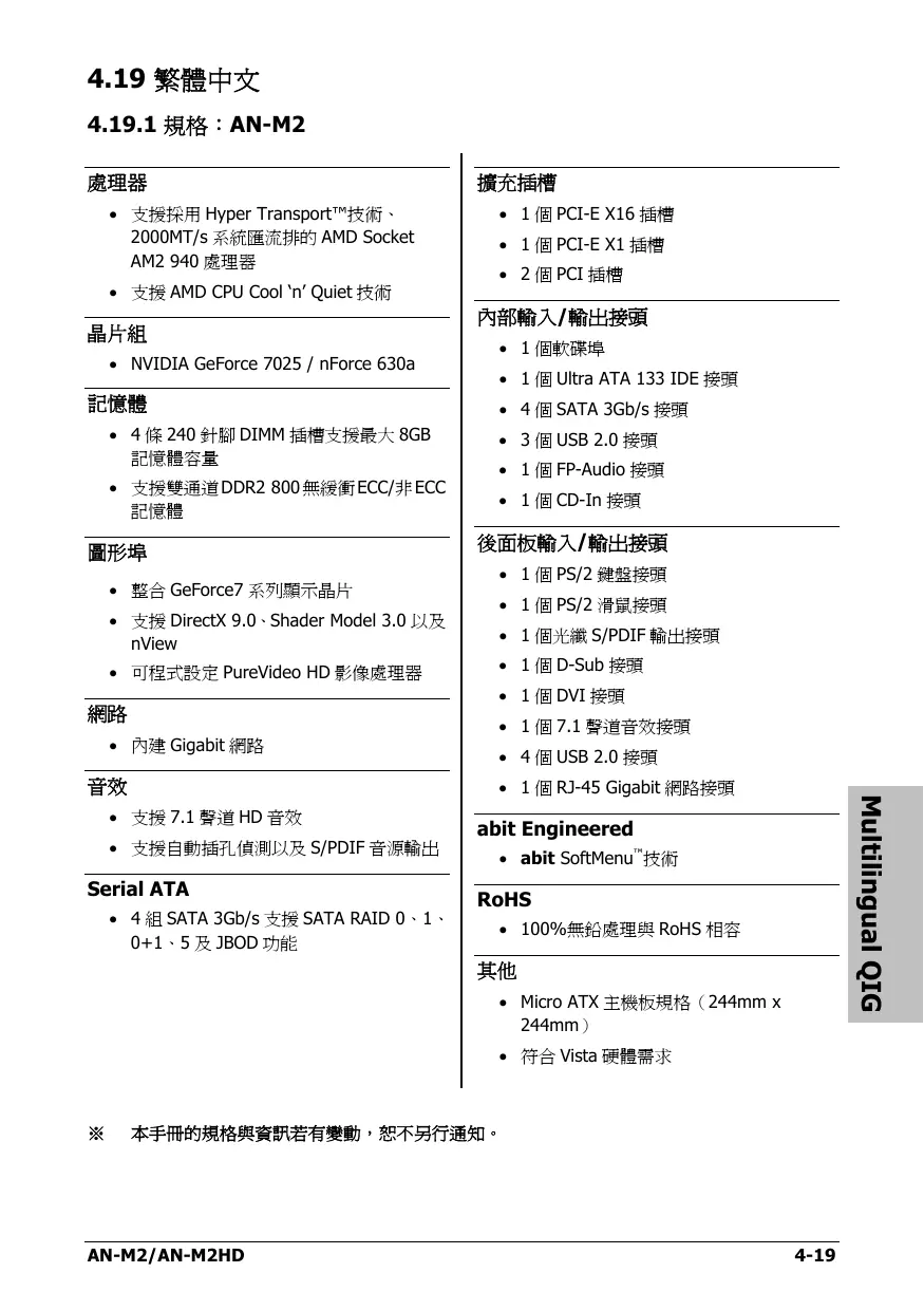 本手冊的規格與資訊若有變動,恕不另行通知。 AN-M2/AN-M2HD 4-19