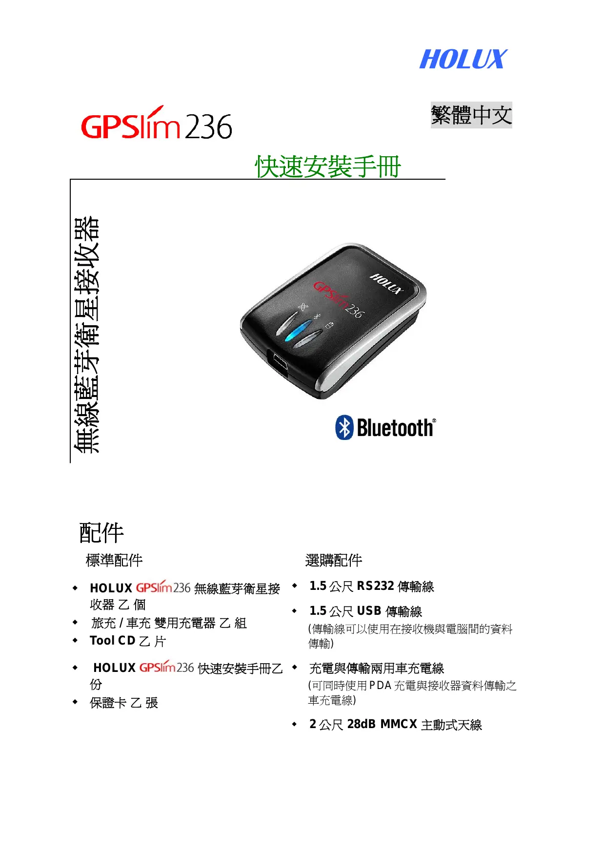 下载您的设备说明 GPS接收器 免费PDF格式!查找您的手册 GPSLIM 236 - HOLUX 并重新掌握您的电子设备。本页发布了使用您的设备所需的所有文档。 GPSLIM 236 品牌 HOLUX.