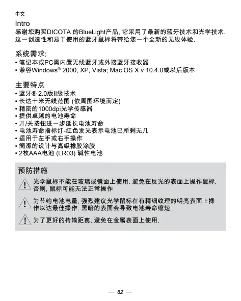 感谢您购买DICOTA的BlueLight产品,它采用了最新的蓝牙技术和光学技术。这一创造性和易于使用的蓝牙鼠标将带给您一个全新的无线体验。