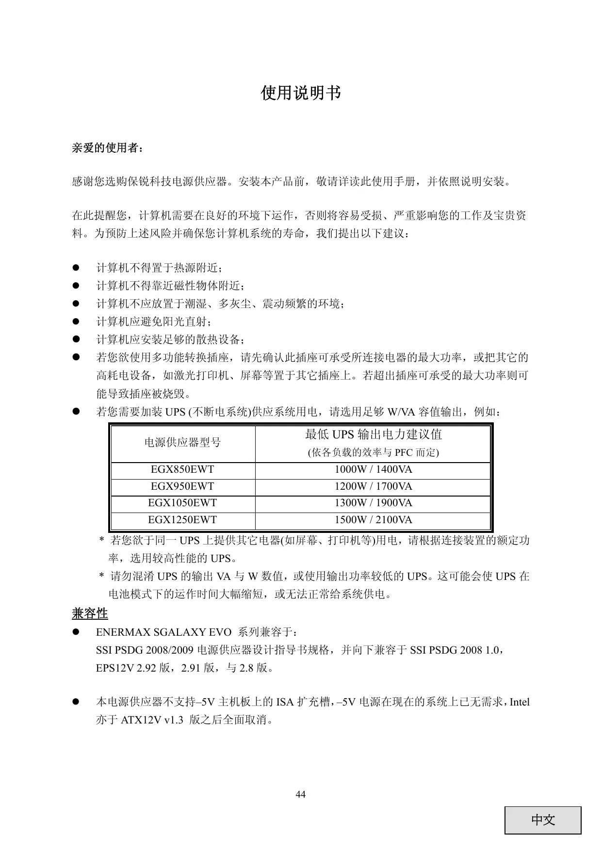兼容性 ENERMAX SGALAXY EVO 系列兼容于: SSI PSDG 2008/2009 电源供应器设计指导书规格,并向下兼容于 SSI PSDG 2008 1.0, EPS12V 2.92 版,2.91 版,与 2.8 版。 本电源供应器不支持–5V 主机板上的 ISA 扩充槽,–5V 电源在现在的系统上已无需求,Intel 亦于 ATX12V v1.3 版之后全面取消。