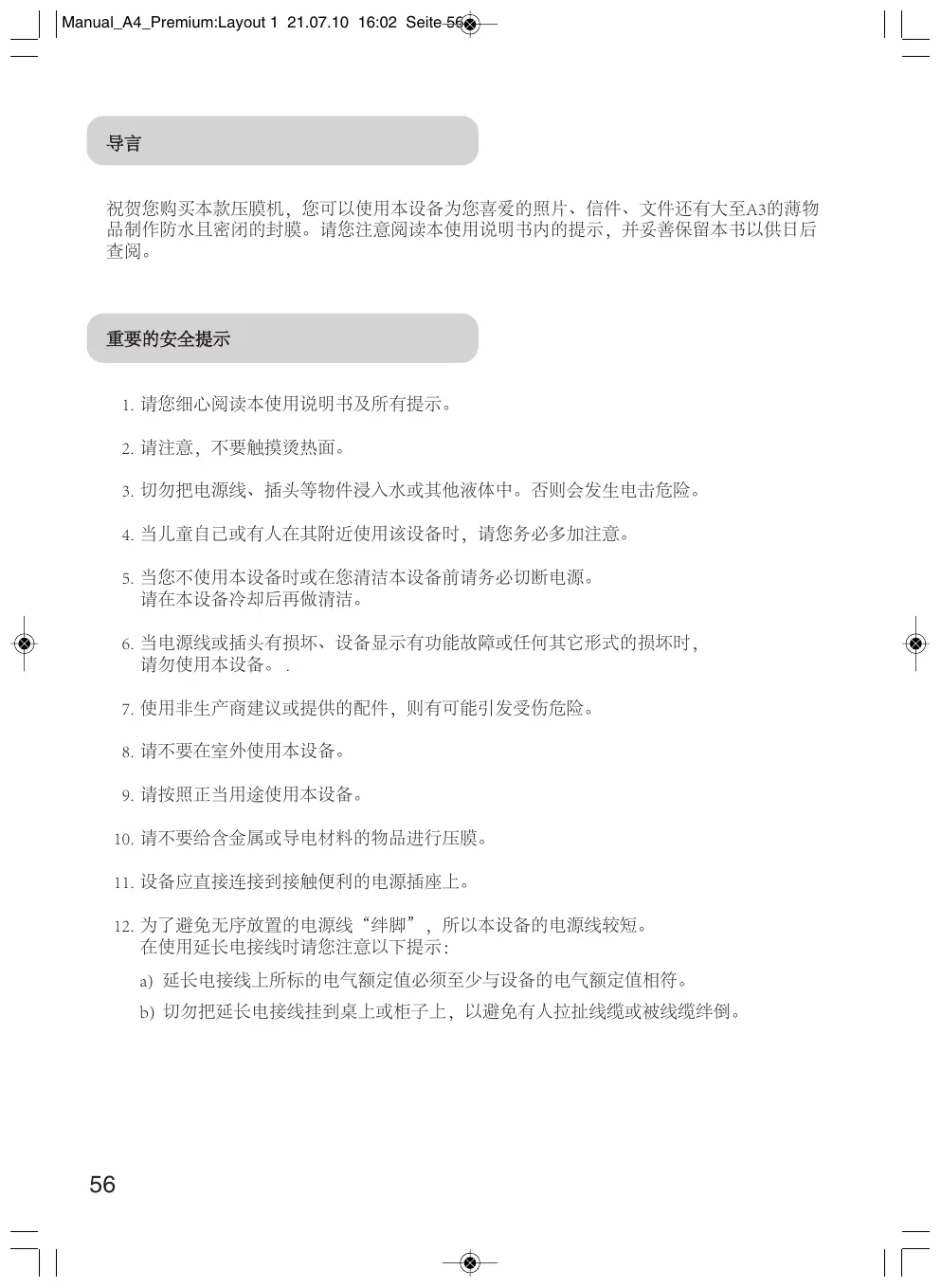 祝贺您购买本款压膜机,您可以使用本设备为您喜爱的照片、信件、文件还有大至A3的薄物 品制作防水且密闭的封膜。请您注意阅读本使用说明书内的提示,并妥善保留本书以供日后