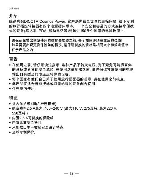 感谢购买DICOTA Cosmos Power. 它解决你在全世界的连接问题! 给予专利的旅行插座转接器有四个电源插头版本. 一个安全和容易的方式连接您便携式的设备(笔记本, PDA, 移动电话等)到超过150多个国家的电源插座上.