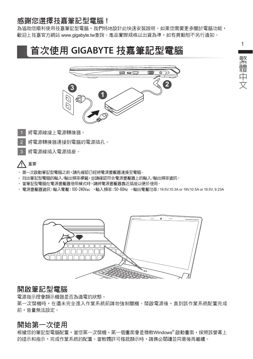 • 第一次啟動筆記型電腦之前,請先確認已經將電源變壓器連接至電腦。 • 找出筆記型電腦的輸入/輸出頻率標籤,並請確認符合電源變壓器上的輸入/輸出頻率資訊。 • 當筆記型電腦在電源變壓器使用模式時,請將電源變壓器靠近插座以便於使用。 • 電源變壓器資訊:輸入電壓:100-240Vac ,輸入頻率:50-60Hz ,輸出電壓功率:19.5V,10.3A or 19V,10.5A or 19.5V, 9.23A