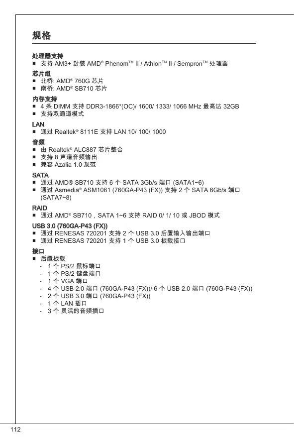 规格 处理器支持 ■ 支持 AM3+ 封装 AMD® PhenomTM II / AthlonTM II / SempronTM 处理器 芯片组 ■ 北桥: AMD® 760G 芯片 ■ 南桥: AMD® SB710 芯片 内存支持 ■ 4 条 DIMM 支持 DDR3-1866*(OC)/ 1600/ 1333/ 1066 MHz 最高达 32GB ■ 支持双通道模式 LAN ■ 通过 Realtek® 8111E 支持 LAN 10/ 100/ 1000 音频 ■ 由 Realtek® ALC887 芯片整合 ■ 支持 8 声道音频输出 ■ 兼容 Azalia 1.0 规范 SATA ■ 通过 AMD® SB710 支持 6 个 SATA 3Gb/s 端口 (SATA1~6) ■ 通过 Asmedia® ASM1061 (760GA-P43 (FX)) 支持 2 个 SATA 6Gb/s 端口 (SATA7~8) RAID ■ 通过 AMD® SB710,SATA 1~6 支持 RAID 0/ 1/ 10 或 JBOD 模式 USB 3.0 (760GA-P43 (FX)) ■ 通过 RENESAS 720201 支持 2 个 USB 3.0 后置输入输出端口 ■ 通过 RENESAS 720201 支持 1 个 USB 3.0 板载接口 接口 ■ 后置板载 ‑ 1 个 PS/2 鼠标端口 ‑ 1 个 PS/2 键盘端口 ‑ 1 个 VGA 端口 ‑ 4 个 USB 2.0 端口 (760GA-P43 (FX))/ 6 个 USB 2.0 端口 (760G-P43 (FX)) ‑ 2 个 USB 3.0 端口 (760GA-P43 (FX)) ‑ 1 个 LAN 插口 ‑ 3 个 灵活的音频插口