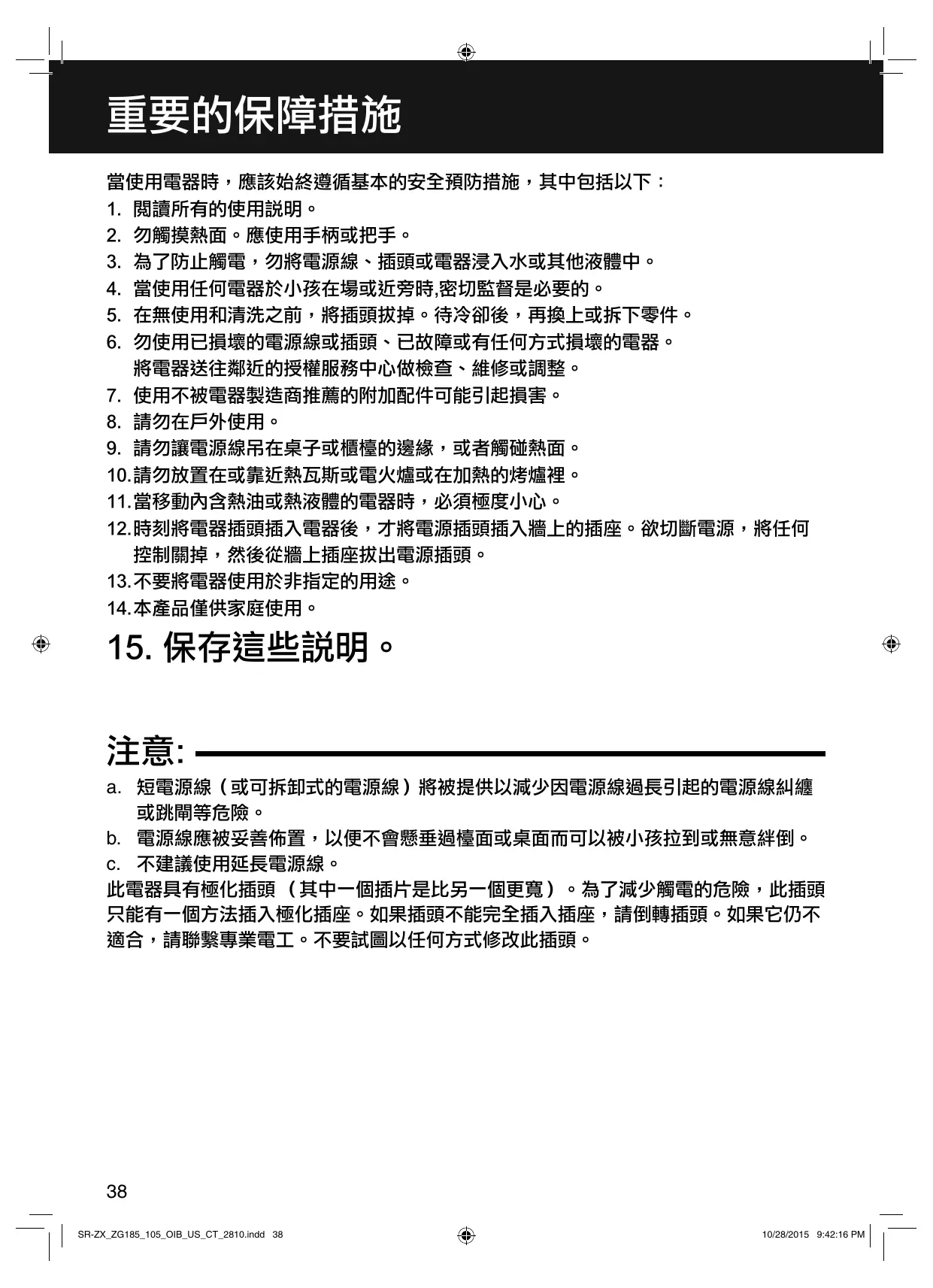 15. 保存這些說明。 注意: a. 短電源線(或可拆卸式的電源線)將被提供以減少因電源線過長引起的電源線糾纏 或跳閘等危險。 b. 電源線應被妥善佈置,以便不會懸垂過檯面或桌面而可以被小孩拉到或無意絆倒。 c. 不建議使用延長電源線。 此電器具有極化插頭 (其中一個插片是比另一個更寬)。為了減少觸電的危險,此插頭 只能有一個方法插入極化插座。如果插頭不能完全插入插座,請倒轉插頭。如果它仍不 適合,請聯繫專業電工。不要試圖以任何方式修改此插頭。