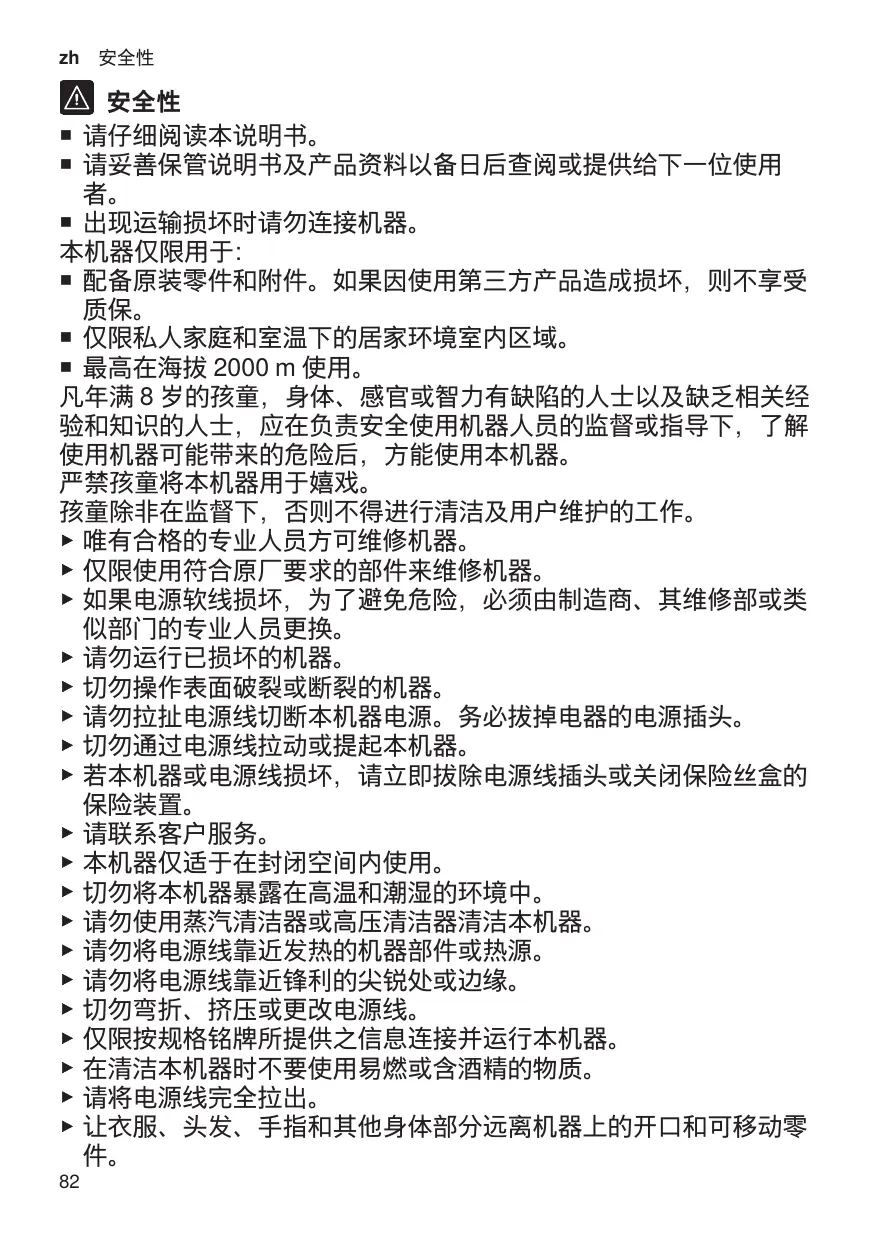安全性 ¡ 请仔细阅读本说明书。 ¡ 请妥善保管说明书及产品资料以备日后查阅或提供给下一位使用 者。 ¡ 出现运输损坏时请勿连接机器。 本机器仅限用于: ¡ 配备原装零件和附件。如果因使用第三方产品造成损坏,则不享受 质保。 ¡ 仅限私人家庭和室温下的居家环境室内区域。 ¡ 最高在海拔 2000 m 使用。 凡年满 8 岁的孩童,身体、感官或智力有缺陷的人士以及缺乏相关经 验和知识的人士,应在负责安全使用机器人员的监督或指导下,了解 使用机器可能带来的危险后,方能使用本机器。 严禁孩童将本机器用于嬉戏。 孩童除非在监督下,否则不得进行清洁及用户维护的工作。 ▶ 唯有合格的专业人员方可维修机器。 ▶ 仅限使用符合原厂要求的部件来维修机器。 ▶ 如果电源软线损坏,为了避免危险,必须由制造商、其维修部或类 似部门的专业人员更换。 ▶ 请勿运行已损坏的机器。 ▶ 切勿操作表面破裂或断裂的机器。 ▶ 请勿拉扯电源线切断本机器电源。务必拔掉电器的电源插头。 ▶ 切勿通过电源线拉动或提起本机器。 ▶ 若本机器或电源线损坏,请立即拔除电源线插头或关闭保险丝盒的 保险装置。 ▶ 请联系客户服务。 ▶ 本机器仅适于在封闭空间内使用。 ▶ 切勿将本机器暴露在高温和潮湿的环境中。 ▶ 请勿使用蒸汽清洁器或高压清洁器清洁本机器。 ▶ 请勿将电源线靠近发热的机器部件或热源。 ▶ 请勿将电源线靠近锋利的尖锐处或边缘。 ▶ 切勿弯折、挤压或更改电源线。 ▶ 仅限按规格铭牌所提供之信息连接并运行本机器。 ▶ 在清洁本机器时不要使用易燃或含酒精的物质。 ▶ 请将电源线完全拉出。 ▶ 让衣服、头发、手指和其他身体部分远离机器上的开口和可移动零 件。 82