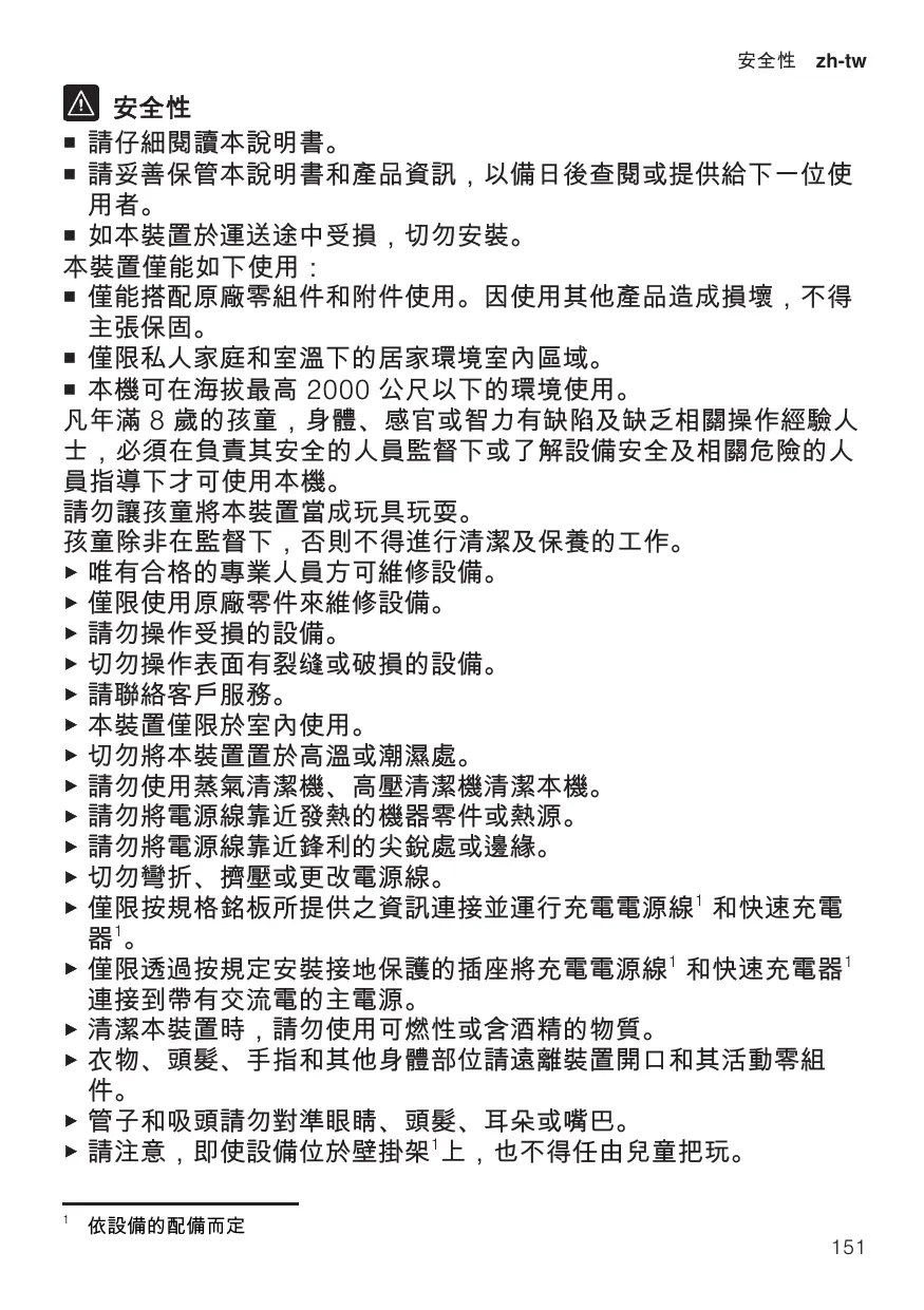 凡年滿8歲的孩童,身體、感官或智力有缺陷及缺乏相關操作經驗人士,必須在負責其安全的人員監督下或了解設備安全及相關危險的人員指導下才可使用本機。