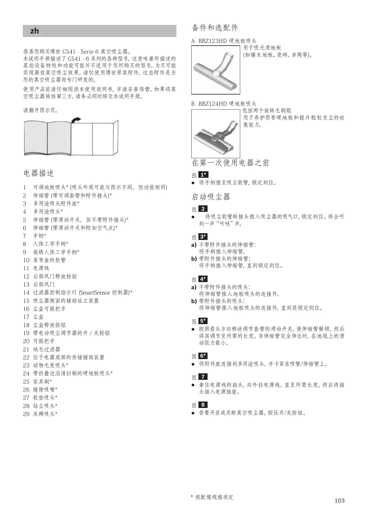 zh 恭喜您购买博世 GS41 - Serie 6 真空吸尘器。 本说明手册描述了 GS41 - 6 系列的各种型号,这意味着所描述的 某些设备特性和功能可能并不适用于您所购买的型号。为尽可能 实现最佳真空吸尘效果,请仅使用博世原装附件,这些附件是为 您的真空吸尘器而专门研发的。