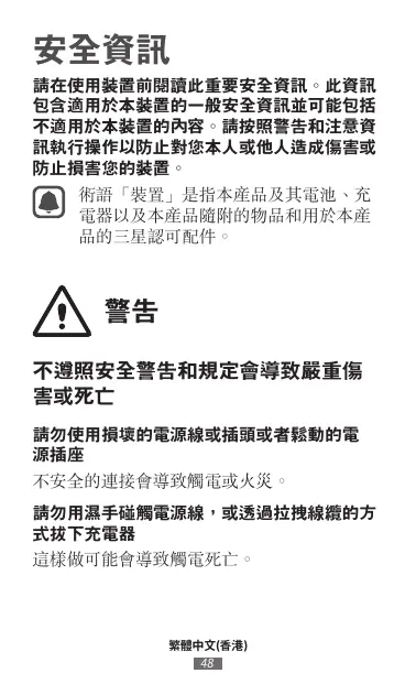安全資訊 請在使用裝置前閱讀此重要安全資訊。此資訊 包含適用於本裝置的一般安全資訊並可能包括 不適用於本裝置的內容。請按照警告和注意資 訊執行操作以防止對您本人或他人造成傷害或 防止損害您的裝置。 術語「裝置」是指本產品及其電池、充 電器以及本產品隨附的物品和用於本產 品的三星認可配件。