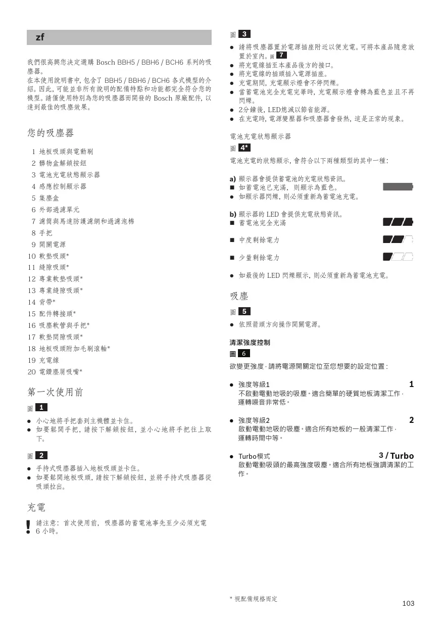 Congratulations on your purchase of the Bosch BBH5 / BBH6 / BCH6 vacuum cleaner. This instruction manual describes various BBH5 / BBH6 / BCH6 models, which means that some of the equipment features and functions described may not apply to your model. You should only use original Bosch accessories, which have been specially developed for your vacuum cleaner, in order to achieve the best possible vacuuming results. Description de l'appareil 1 Brosse pour sols avec électrobrosse 2 Bouton de déverrouillage du collecteur de saletés 3 Indicateur de l'état de charge de la batterie 4 Indicateur Sensor Control 5 Collecteur de poussières