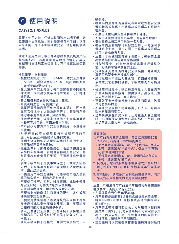 LIRE ATTENTIVEMENT ET ENTIÈREMENT CETTE NOTICE POUR ÉVITER TOUT DANGER ET LA CONSERVER POUR TOUTE RÉFÉRENCE FUTURE. POUR NE PAS COMPROMETTRE LA SÉCURITÉ DE VOTRE ENFANT, SUIVEZ ATTENTIVEMENT CES INSTRUCTIONS. ATTENTION ! AVANT D’UTILISER LE PRODUIT, ÔTER ET ÉLIMINER TOUS LES SACHETS EN PLASTIQUE ÉVENTUELS ET TOUS LES ÉLÉMENTS COMPOSANT L’EMBALLAGE DU PRODUIT ET LES TENIR HORS DE PORTÉE DES ENFANTS. IL EST CONSEILLÉ D’ÉLIMINER CES ÉLÉMENTS EN FAISANT LE TRI SÉLECTIF CONFORMÉMENT AUX LOIS EN VIGUEUR. TRÈS IMPORTANT ! À LIRE IMMÉDIATEMENT • Ce siège-auto est homologué “Groupe 2/3”, pour le transport d’enfants de 15 à 36 Kg (de 3 à 12 ans de façon indicative), conformément au règlement européen ECE R 44/04. • Chaque pays applique des lois et des règlements différents en matière de sécurité pour le transport des enfants en voiture. C’est pourquoi il est conseillé de contacter les autorités locales pour obtenir davantage d’informations. • Les activités de réglage du siège-auto doivent être effectuées exclusivement par un adulte. • Éviter que quiconque utilise le produit sans avoir lu la notice. • Le risque de blessures de l’enfant, non seulement en cas d’accident mais aussi dans d’autres circonstances (par ex. freinages brusques, etc.) augmente si les indications de cette notice ne sont pas suivies scrupuleusement. • Conserver la Notice pour toute référence future : une poche permettant de ranger la notice se trouve derrière le dossier du siège auto. • Le produit doit être utilisé exclusivement comme siège-auto et ne doit pas être utilisé à la maison. • La société Artsana décline toute responsabilité en cas d’utilisation incorrecte du produit et pour toute utilisation différente de cette notice. • Aucun siège-auto ne peut garantir la sécurité totale de l’enfant en cas d’accident, mais son utilisation réduit le risque de blessures graves. • Transporter un enfant dans un siège-auto correctement installé, même lors de trajets brefs ; dans le cas contraire, cela pourrait nuire à sa sécurité. Vérifier notamment que la ceinture est correcte-