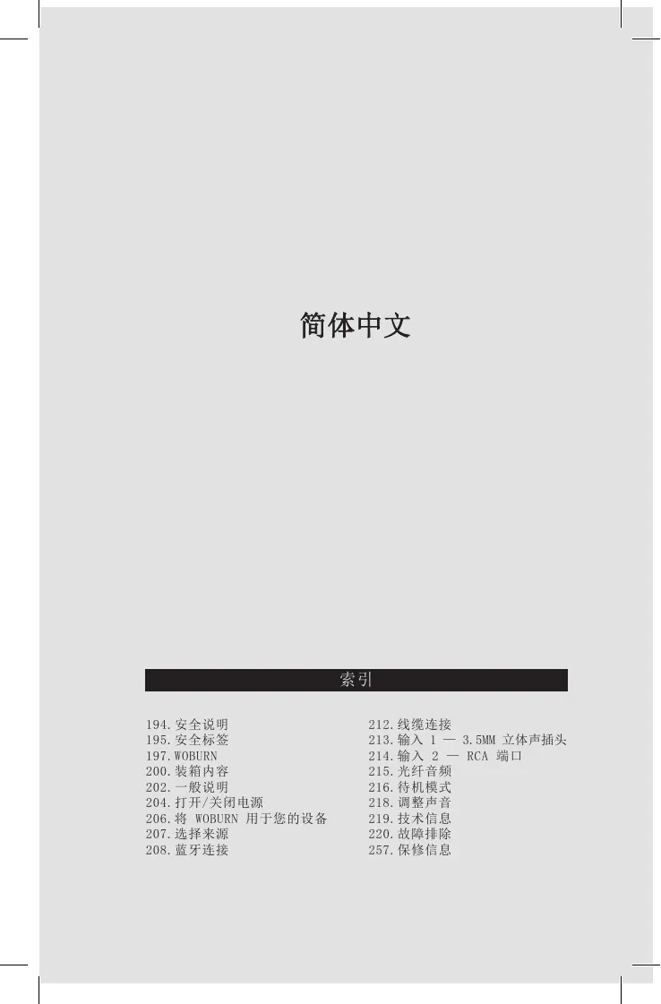 194.安全说明 195.安全标签 197.WOBURN 200.装箱内容 202.一般说明 204.打开/关闭电源 206.将 WOBURN 用于您的设备 207.选择来源 208.蓝牙连接 212.线缆连接 213.输入 1 — 3.5MM 立体声插头 214.输入 2 — RCA 端口 215.光纤音频 216.待机模式 218.调整声音 219.技术信息 220.故障排除 257.保修信息