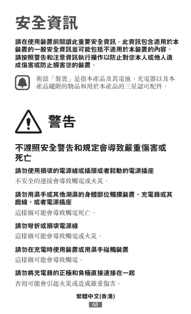 請在使用裝置前閱讀此重要安全資訊。此資訊包含適用於本 裝置的一般安全資訊並可能包括不適用於本裝置的內容。 請按照警告和注意資訊執行操作以防止對您本人或他人造 成傷害或防止損害您的裝置。 術語「裝置」是指本產品及其電池、充電器以 及本產品的隨附項目和用於本產品的三星核可