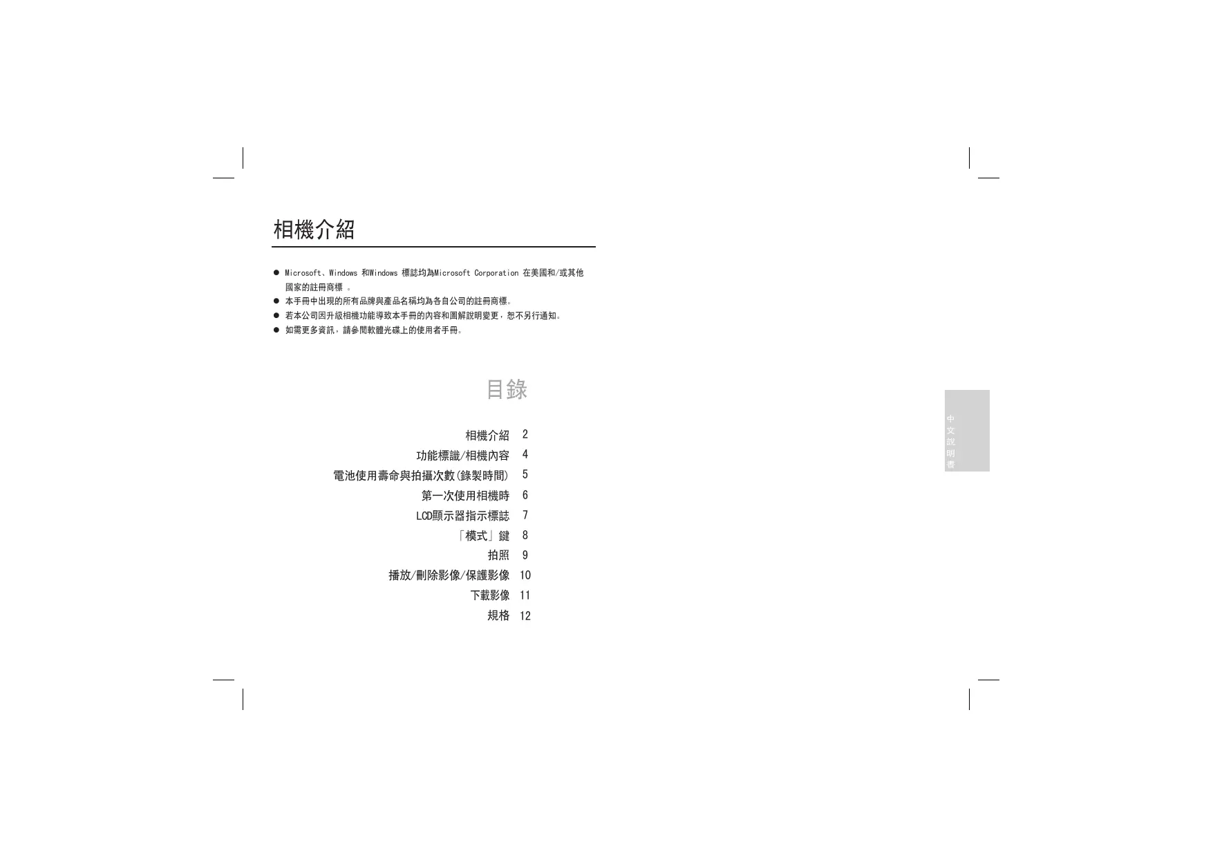 z Microsoft、Windows 和Windows 標誌均為Microsoft Corporation 在美國和/或其他 z 本手冊中出現的所有品牌與產品名稱均為各自公司的註冊商標。 z 若本公司因升級相機功能導致本手冊的內容和圖解說明變更,恕不另行通知。 z 如需更多資訊,請參閱軟體光碟上的使用者手冊。