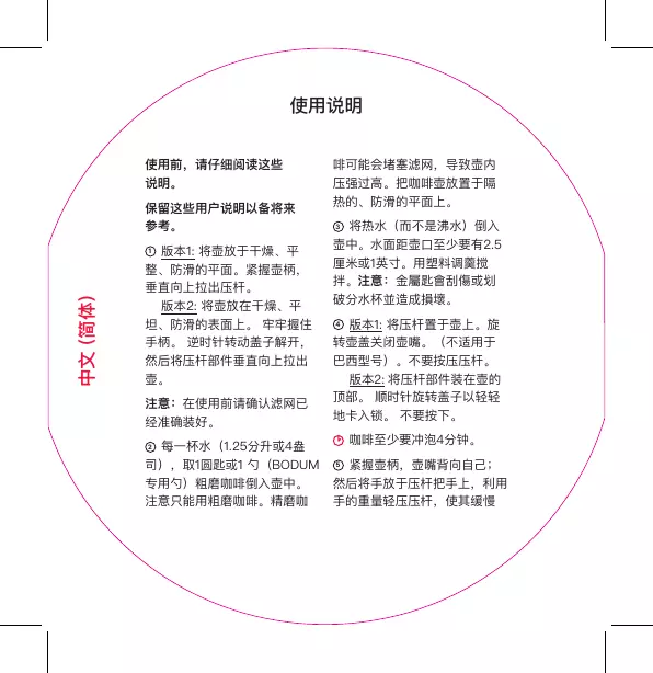 注意:在使用前请确认滤网已 2 每一杯水(1.25分升或4盎 司),取1圆匙或1 勺(BODUM 专用勺)粗磨咖啡倒入壶中。 注意只能用粗磨咖啡。精磨咖 啡可能会堵塞滤网,导致壶内 压强过高。把咖啡壶放置于隔 3 将热水(而不是沸水)倒入 壶中。水面距壶口至少要有2.5 厘米或1英寸。用塑料调羹搅 拌。注意:金屬匙會刮傷或划 4 版本1: 将压杆置于壶上。旋 转壶盖关闭壶嘴。(不适用于 巴西型号)。不要按压压杆。 版本2: 将压杆部件装在壶的 顶部。 顺时针旋转盖子以轻轻 地卡入锁。 不要按下。 咖啡至少要冲泡4分钟。 紧握壶柄,壶嘴背向自己; 然后将手放于压杆把手上,利用 手的重量轻压压杆,使其缓慢