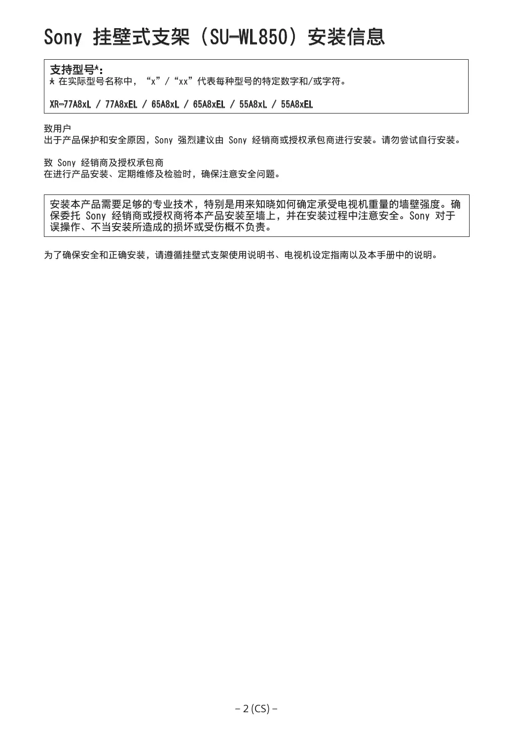 L’installation de ce produit exige un certain savoir-faire. Lisez ce mode d’emploi attentivement afin de procéder à l’installation en toute sécurité. Sony ne saurait être tenue responsable de tout dommage ou de toute blessure découlant d’une mauvaise utilisation ou d’une installation incorrecte. Une fois l’installation terminée, veuillez remettre ce manuel d’installation au client. Ce mode d’emploi indique comment manipuler le produit correctement et contient des précautions essentielles à prendre pour éviter tout accident. Il vous incombe de lire, bien comprendre et suivre toutes les instructions de ce mode d’emploi. Ne pas respecter cette consigne peut entraîner des blessures ou des dommages matériels, et peut invalider la garantie. Conservez ce mode d’emploi pour toute référence ultérieure. Les produits Sony sont conçus pour vous offrir le maximum de sécurité. Toutefois, si les produits sont utilisés de façon incorrecte, ils peuvent entraîner des blessures graves en provoquant un incendie ou l’électrocution, ou encore la chute de l’appareil hors de son support. Veillez à observer les consignes de sécurité préconisées pour éviter de tels accidents.