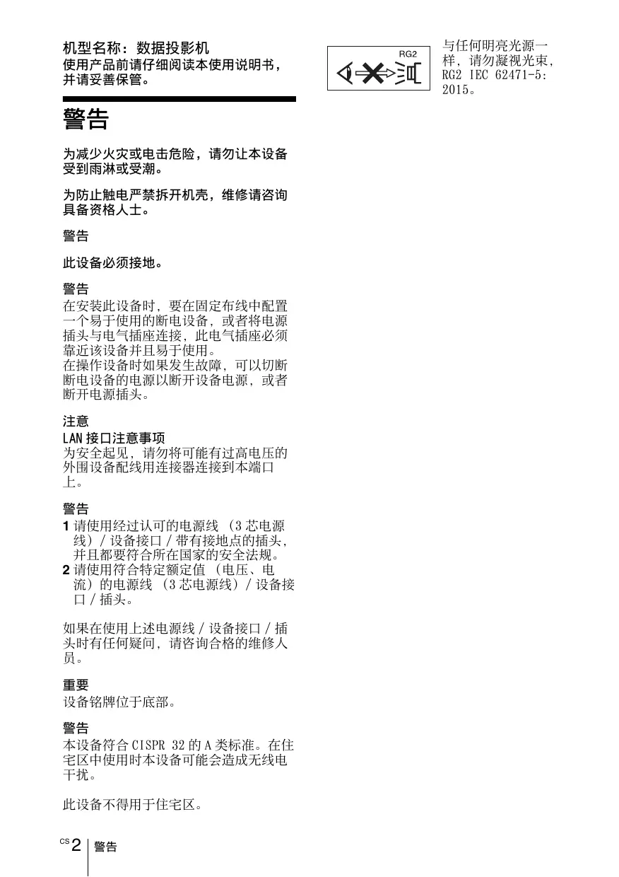 警告 为减少火灾或电击危险,请勿让本设备 受到雨淋或受潮。 为防止触电严禁拆开机壳,维修请咨询 具备资格人士。 警告 此设备必须接地。 警告 在安装此设备时,要在固定布线中配置 一个易于使用的断电设备,或者将电源 插头与电气插座连接,此电气插座必须 靠近该设备并且易于使用。 在操作设备时如果发生故障,可以切断 断电设备的电源以断开设备电源,或者 断开电源插头。 注意 LAN 接口注意事项 为安全起见,请勿将可能有过高电压的 外围设备配线用连接器连接到本端口 上。 警告 1 请使用经过认可的电源线 (3 芯电源 线)/ 设备接口 / 带有接地点的插头, 并且都要符合所在国家的安全法规。 2 请使用符合特定额定值 (电压、电 流)的电源线 (3 芯电源线)/ 设备接 口 / 插头。 如果在使用上述电源线 / 设备接口 / 插 头时有任何疑问,请咨询合格的维修人 员。 重要 设备铭牌位于底部。 警告 本设备符合 CISPR 32 的 A 类标准。在住 宅区中使用时本设备可能会造成无线电 干扰。 此设备不得用于住宅区。 CS