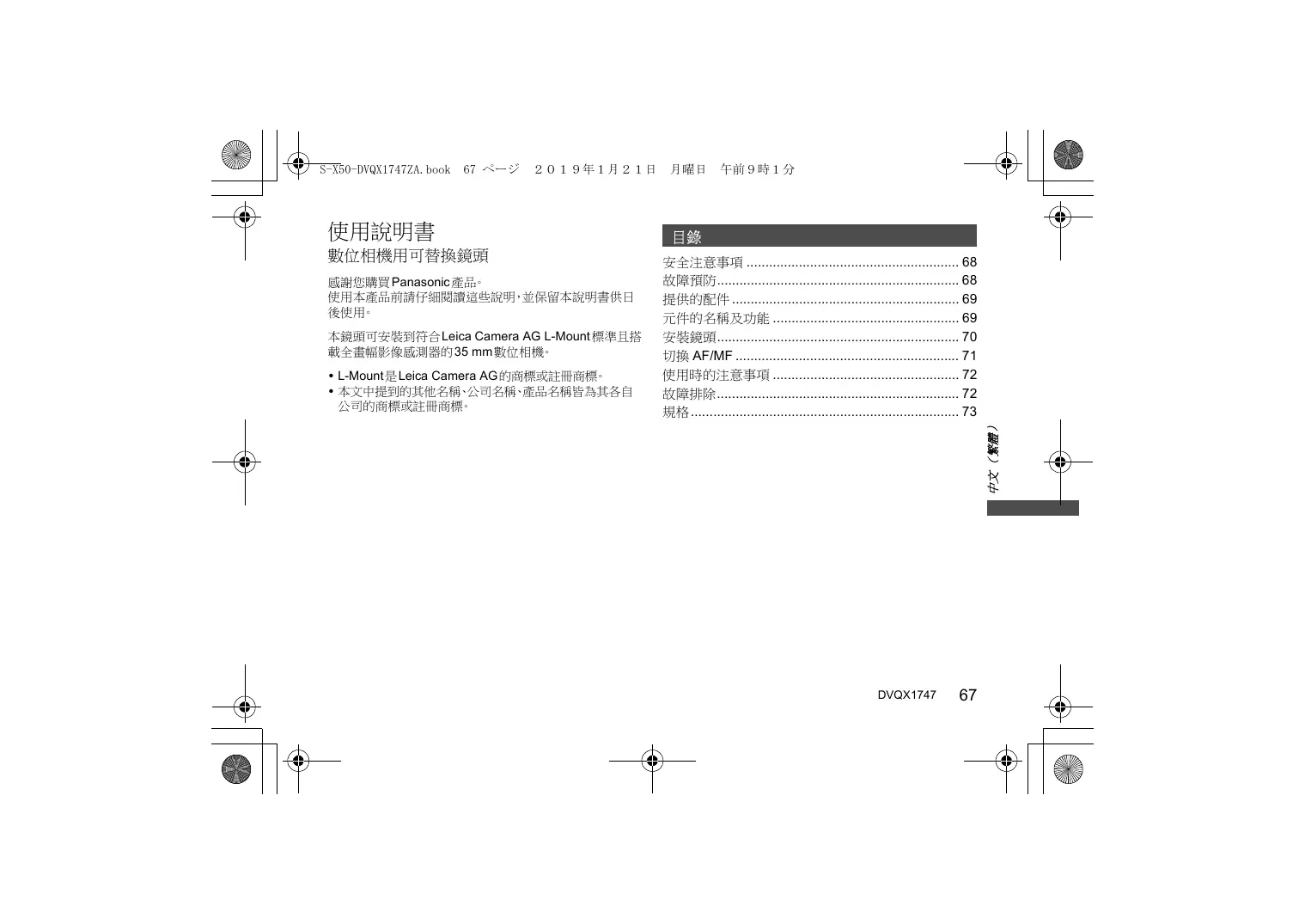 使用說明書 數位相機用可替換鏡頭 感謝您購買 Panasonic 產品。 使用本產品前請仔細閱讀這些說明,並保留本說明書供日 後使用。 本鏡頭可安裝到符合Leica Camera AG L-Mount 標準且搭 載全畫幅影像感測器的 35 mm數位相機。