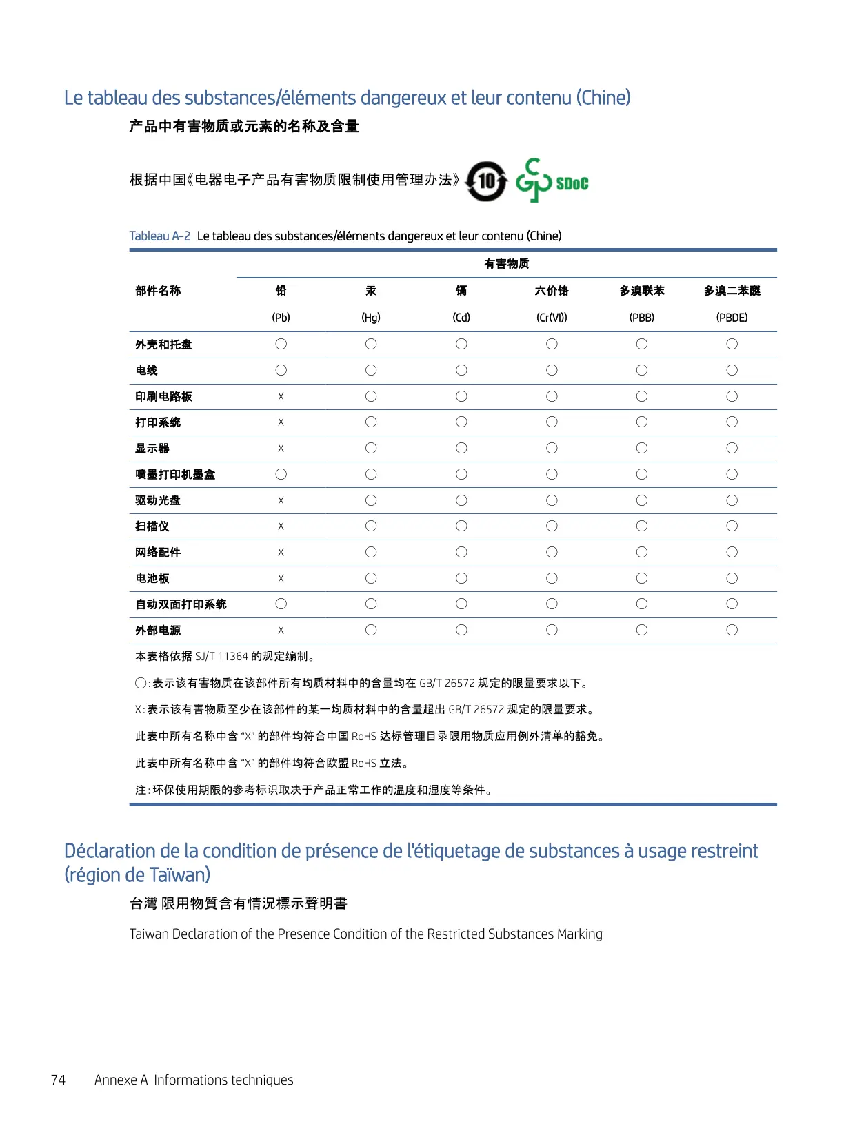 Programme de recyclage. Programme de recyclage de fournitures à jet d'encre HP. Consommation d'énergie. Mise au rebut de l'équipement usagé par les utilisateurs . Élimination des déchets au Brésil. Substances chimiques. Le tableau des substances/éléments dangereux et leur contenu (Chine). Déclaration de la condition de présence de l'étiquetage de substances à usage restreint (région de Taïwan) Restriction sur les substances dangereuses (Inde) Déclaration concernant Les restrictions sur les substances dangereuses (Turquie) . EPEAT.. Informations utilisateur Ecolabel SEPA (Chine) . Eco-label pour imprimante, télécopieur et photocopieuse (Chine).
