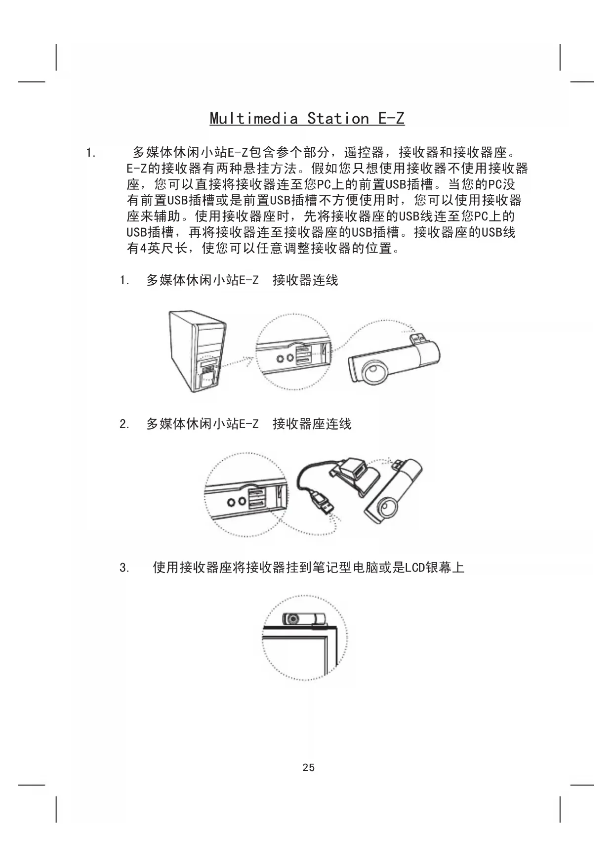 1. 多媒体休闲小站E-Z包含参个部分,遥控器,接收器和接收器座。