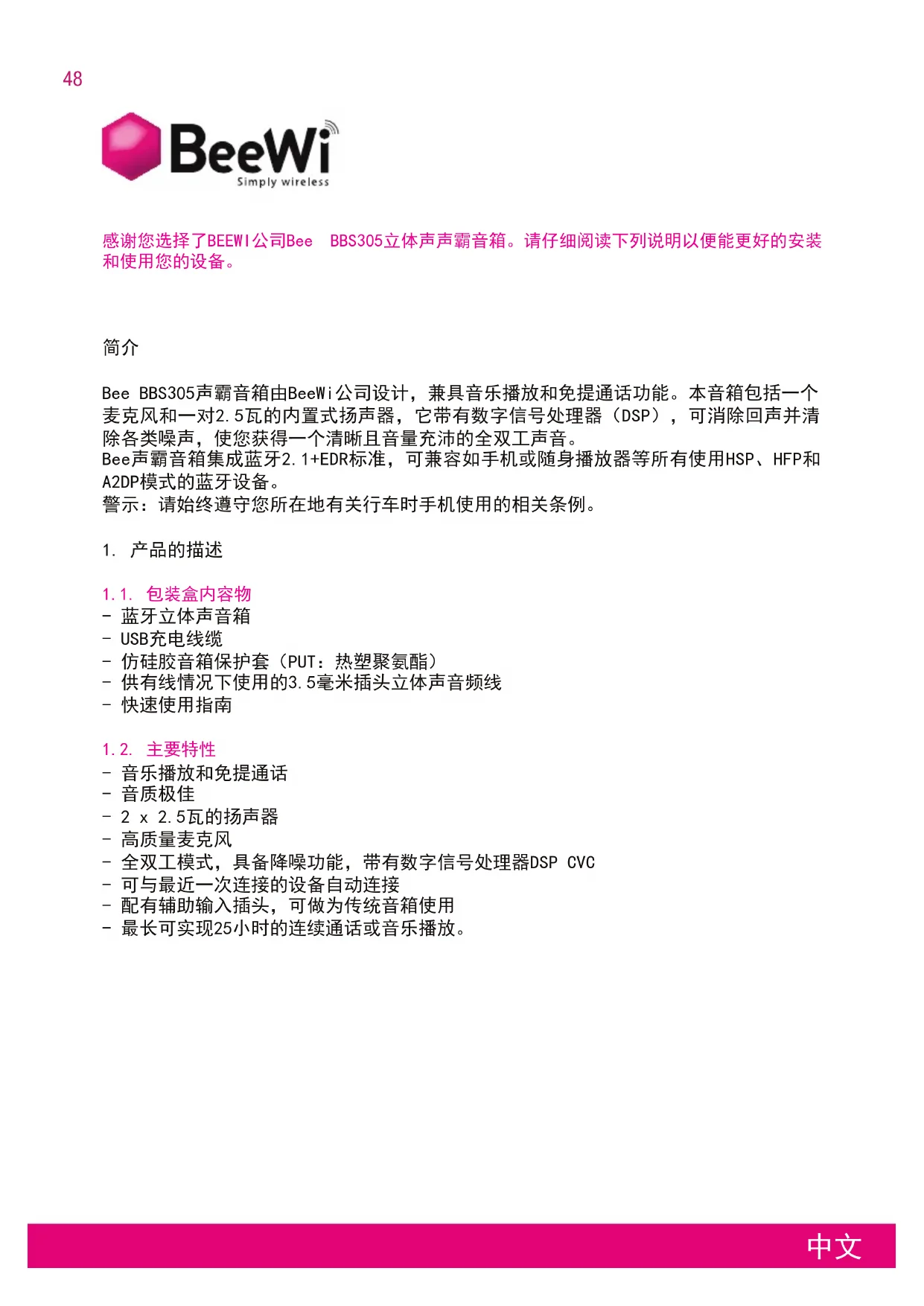 频率范围 2.4吉赫兹~2.48吉赫兹的ISM波段 功率和有效距离 2级,最远10米 音频输出功率 2 x 2.5瓦(1千赫兹,THD(总谐波失真)<3%) 响应频率 60赫兹至20000赫兹 通话时续航时间 最长25小时(最大音量时为15个小时) 音乐播放时续航时间 最长25小时(最大音量时为15个小时) 电池 2000毫安时锂聚合物充电电池 尺寸 156 x 56 x 51.5毫米 重量 380克 中文50 2.3. 配对和连接 请参考手机使用手册中有关蓝牙配对的说明。 一旦音箱通电,配对模式将自动启动(蓝色/红色指示灯交替闪烁),您也可按下键至少 6秒不放,直到蓝色/红色二极管指示灯闪烁后再松开此键从而启动手动配对模式。本产 品此时将处于配对模式。 请在手机上搜索蓝牙设备,然后在屏幕中选择“BeeWi BBS305”,您可能需要输入配对 码“0000”以便将此音箱添加到配对设备列表中并建立连接。 请使用手机进行通话或播放音乐以检查连接情况。 2.4. 连接 开机后,音箱将自动连接最后一次已经完成连接的设备。如果不属于这种情况,音箱将
