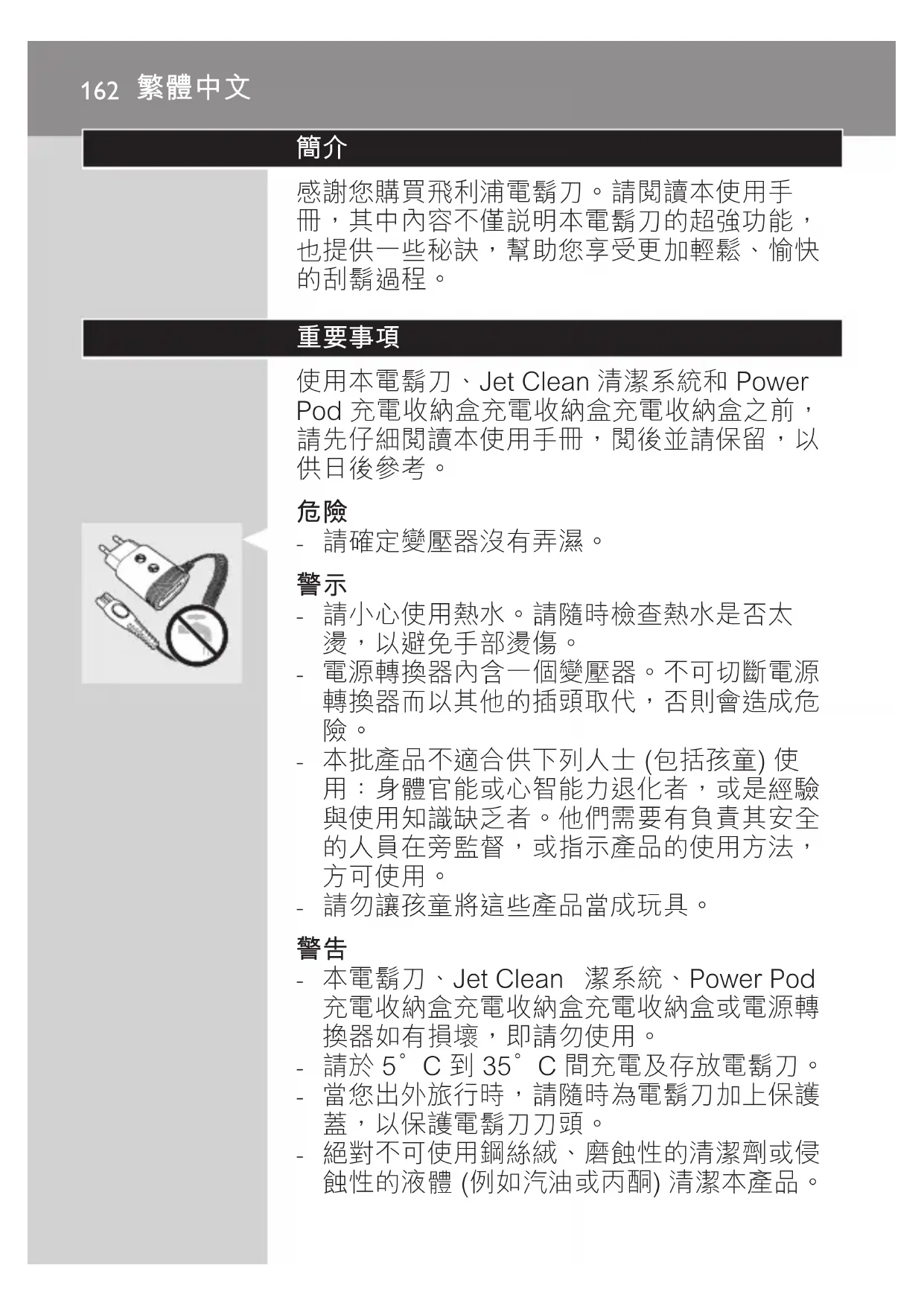 請於 5°C 到 35°C 間充電及存放電鬍刀。