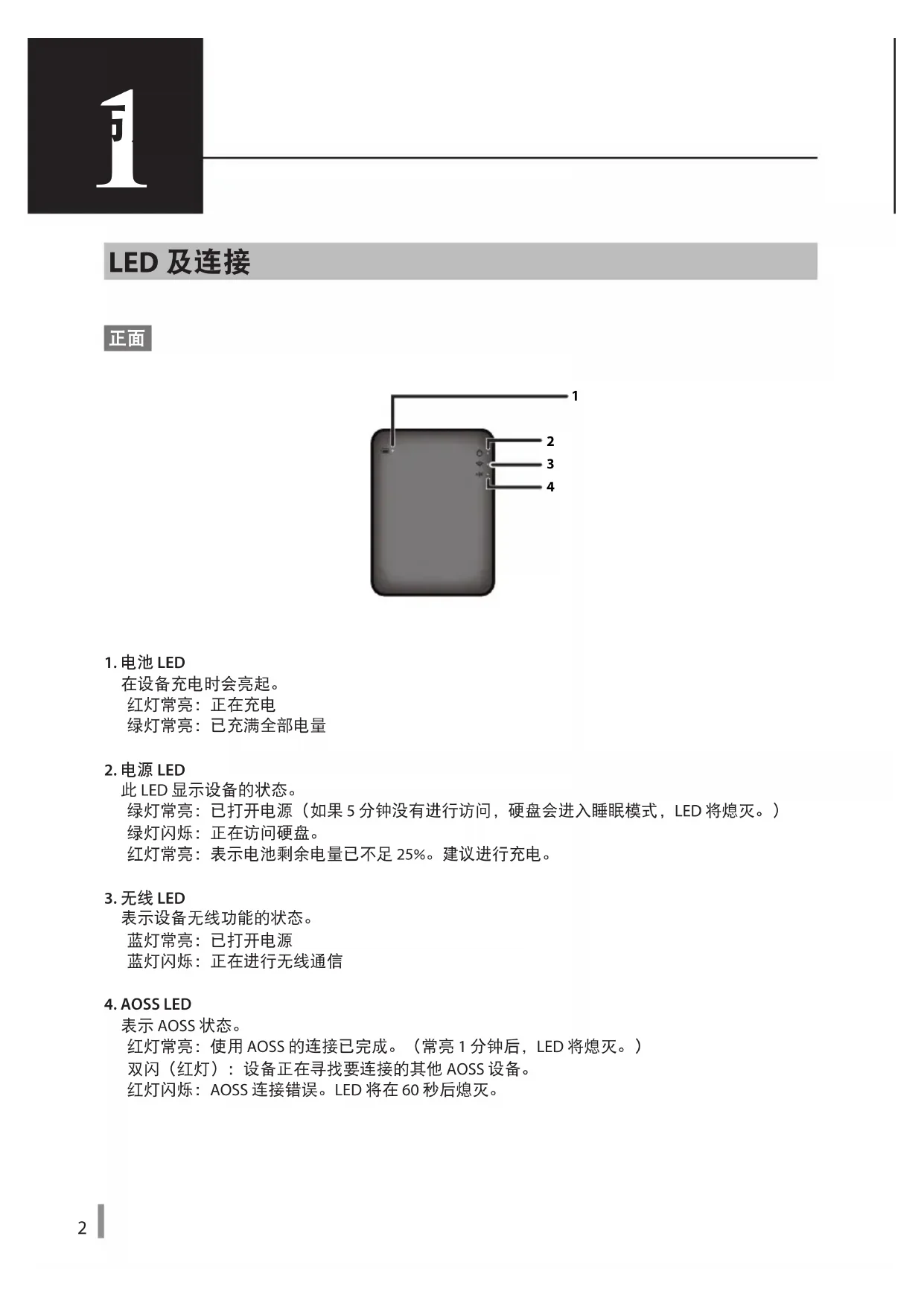 1. 电池 LED在设备充电时会亮起。红灯常亮:正在充电绿灯常亮:已充满全部电量2. 电源 LED此 LED 显示设备的状态。 绿灯常亮:已打开电源(如果 5 分钟没有进行访问,硬盘会进入睡眠模式,LED 将熄灭。) 绿灯闪烁:正在访问硬盘。红灯常亮:表示电池剩余电量已不足 25%。建议进行充电。3. 无线 LED表示设备无线功能的状态。蓝灯常亮:已打开电源蓝灯闪烁:正在进行无线通信4. AOSS LED表示 AOSS 状态。 红灯常亮:使用 AOSS 的连接已完成。(常亮 1 分钟后,LED 将熄灭。) 双闪(红灯):设备正在寻找要连接的其他 AOSS 设备。 红灯闪烁:AOSS 连接错误。LED 将在 60 秒后熄灭。