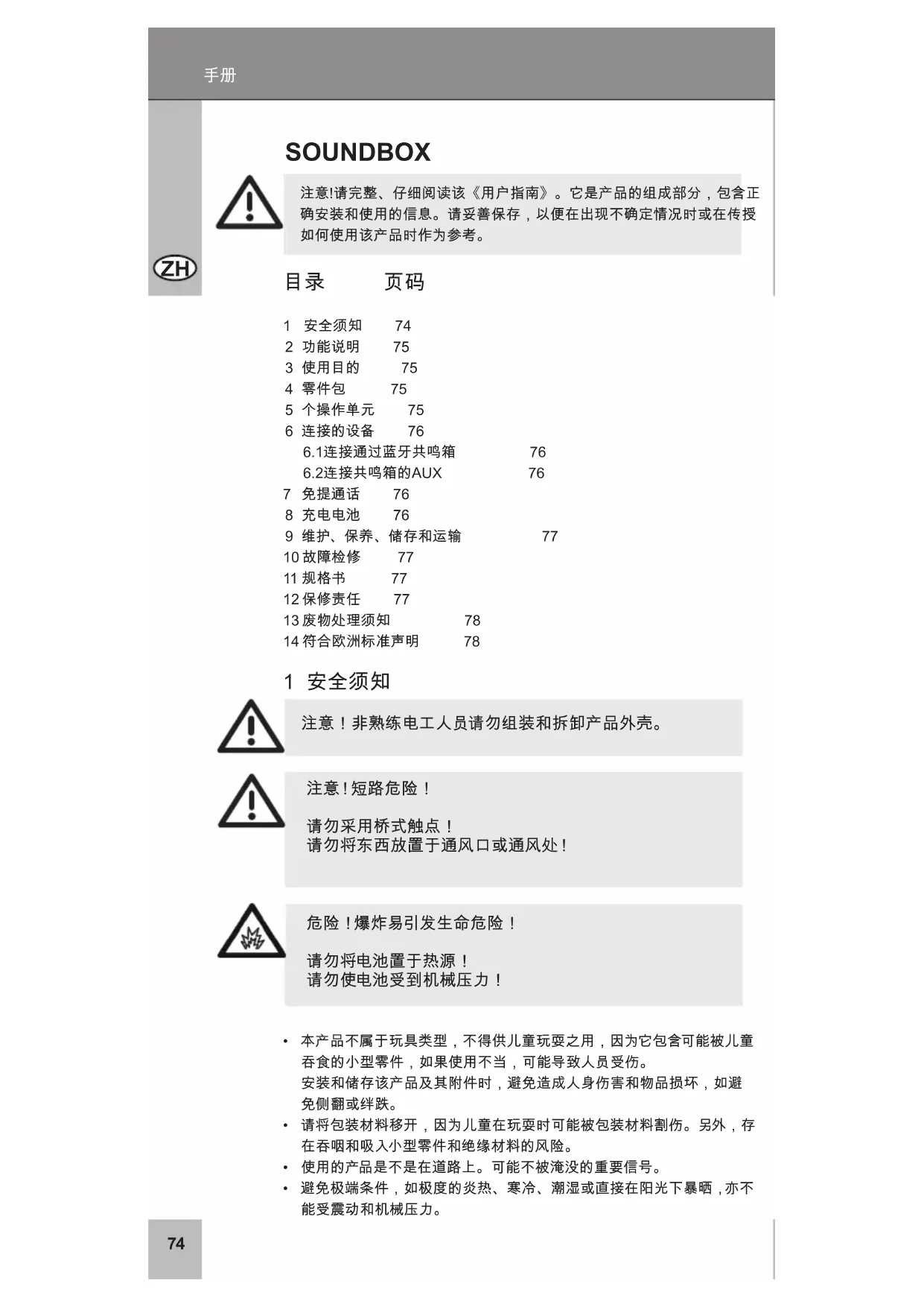 1 安全须知 74 2 功能说明 75 3 使用目的 75 4 零件包 75 5 个操作单元 75 6 连接的设备 76 6.1连接通过蓝牙共鸣箱 76 6.2连接共鸣箱的AUX 76 7 免提通话 76 8 充电电池 76 9 维护、保养、储存和运输 77 10 故障检修 77 11 规格书 77 12 保修责任 77 13 废物处理须知 78 14 符合欧洲标准声明 78 1 安全须知 注意!非熟练电工人员请勿组装和拆卸产品外壳。