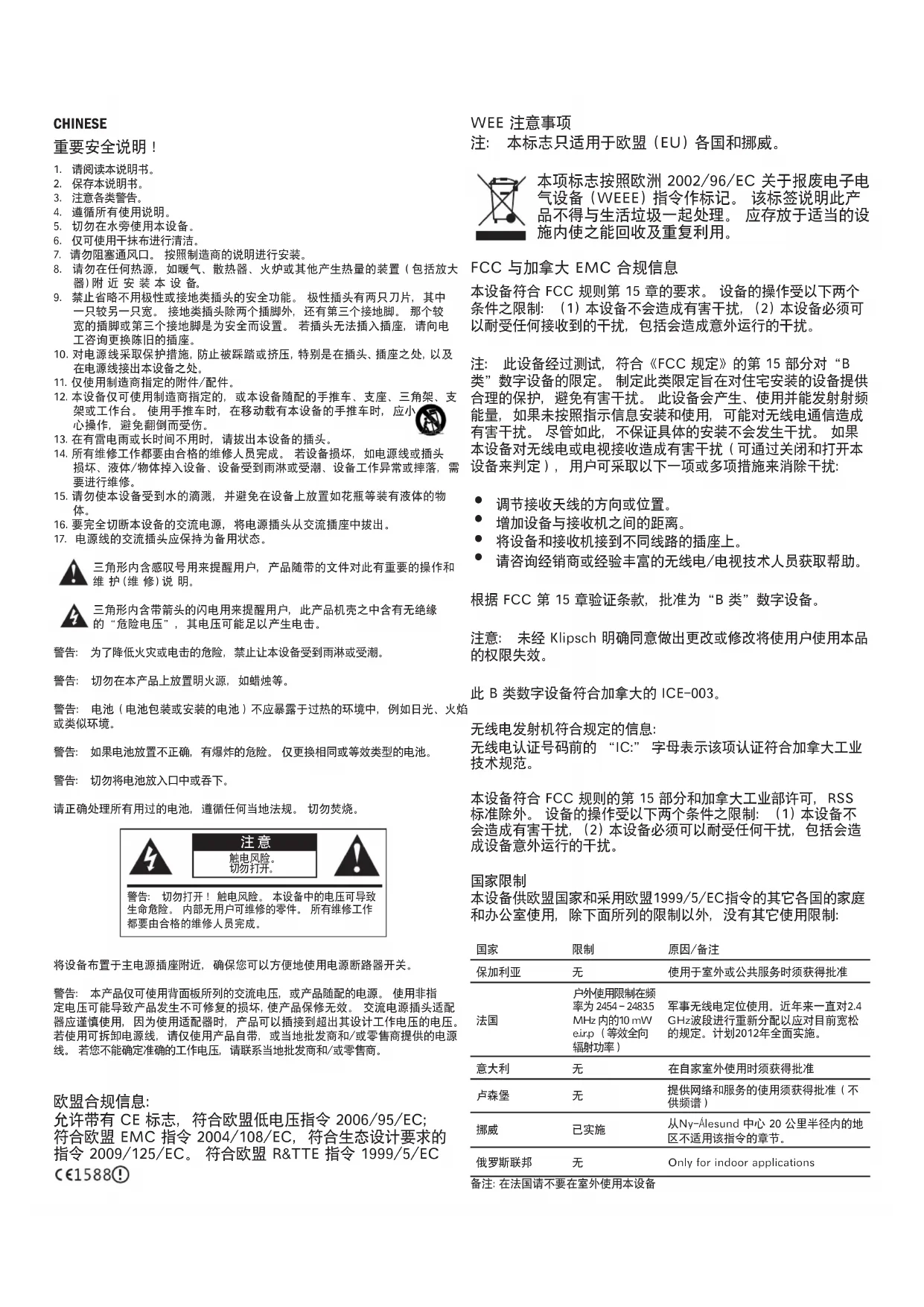 注意:未经Klipsch明确同意做出更改或修改将使用户使用本品