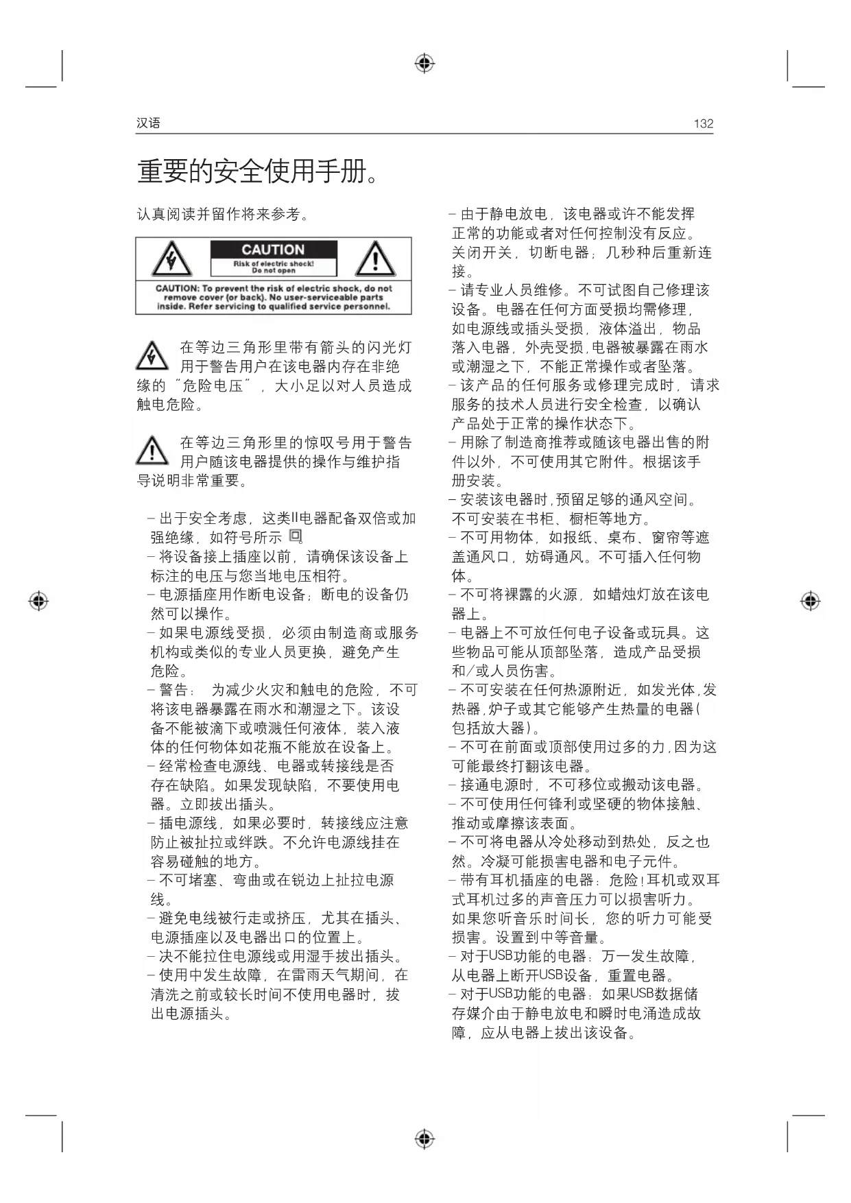 – 不可将电器从冷处移动到热处,反之也 然。冷凝可能损害电器和电子元件。 – 带有耳机插座的电器: 危险!耳机或双耳 式耳机过多的声音压力可以损害听力。 如果您听音乐时间长, 您的听力可能受 损害。设置到中等音量。 – 对于USB功能的电器:万一发生故障, 从电器上断开USB设备,重置电器。 – 对于USB功能的电器:如果USB数据储 存媒介由于静电放电和瞬时电涌造成故 障,应从电器上拔出该设备。汉语