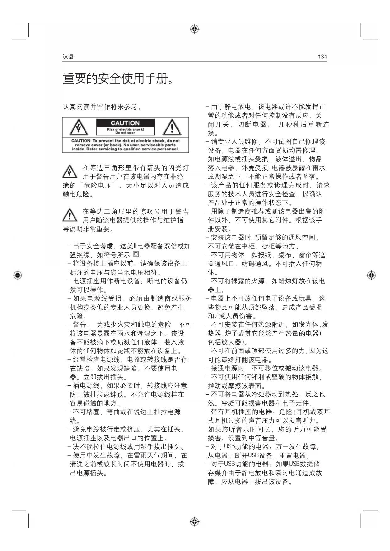 – 不可将电器从冷处移动到热处,反之也 然。冷凝可能损害电器和电子元件。 – 带有耳机插座的电器: 危险!耳机或双耳 式耳机过多的声音压力可以损害听力。 如果您听音乐时间长, 您的听力可能受 损害。设置到中等音量。 – 对于USB功能的电器:万一发生故障, 从电器上断开USB设备,重置电器。 – 对于USB功能的电器:如果USB数据储 存媒介由于静电放电和瞬时电涌造成故 障,应从电器上拔出该设备。汉语