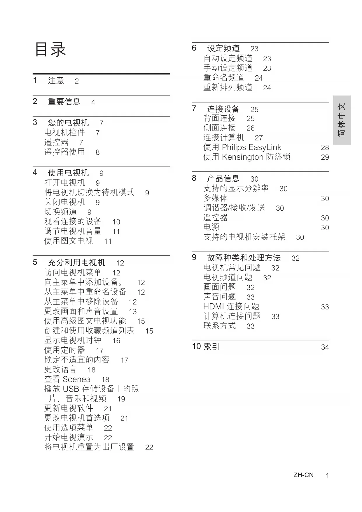 简体中文 ZH-CN• 告知儿童爬上家具触摸电视机可能带来的危险。吞咽电池的危险!• 产品/遥控器可能包含纽扣式电池,容易被吞咽。始终将电池放在儿童接触不到的地方!小心过热!• 切勿将电视机安装在封闭空间内。始终在电视机周围留出至少4英寸或10厘米的空间以便通风。确保窗帘或其它物体不会遮挡电视机上的通风槽。小心人身伤害、起火或电源线损坏!• 切勿将电视机或任何物体放在电 源线上。 • 在雷电天气之前,应断开电视的电源和天线。在雷雨天气里,切勿触摸电视机、电源线或天线的任 何部分。 小心听力损害!• 避免在高音量下或长时间使用耳机 或听筒。