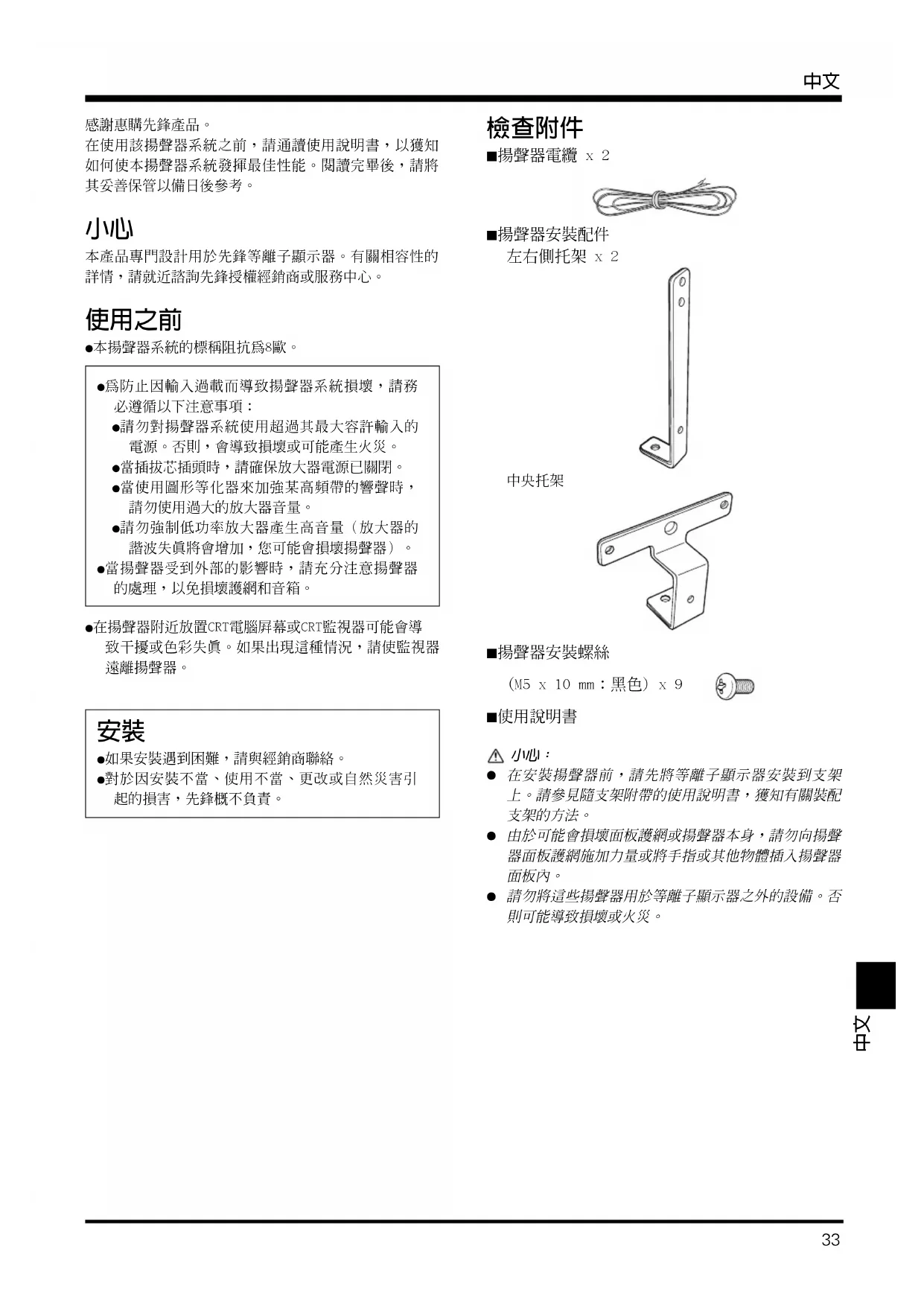 中文 感謝惠購先鋒產品。在使用該揚聲器系統之前,請通讀使用說明書,以獲知如何使本揚聲器系統發揮最佳性能。閱讀完畢後,請將其妥善保管以備日後參考。 小心 本產品專門設計用於先鋒等離子顯示器。有關相容性的詳情,請就近諮詢先鋒授權經銷商或服務中心。 使用之前 ÷ 本揚聲器系統的標稱阻抗為8歐。÷ 為防止因輸入過載而導致揚聲器系統損壞,請務必遵循以下注意事項:÷ 請勿對揚聲器系統使用超過其最大容許輸入的電源。否則,會導致損壞或可能產生火災。÷ 當插拔芯插頭時,請確保放大器電源已關閉。÷ 當使用圖形等化器來加強某高頻帶的響聲時,請勿使用過大的放大器音量。÷ 請勿強制低功率放大器產生高音量(放大器的諧波失真將會增加,您可能會損壞揚聲器)。÷ 當揚聲器受到外部的影響時,請充分注意揚聲器的處理,以免損壞護網和音箱。÷ 在揚聲器附近放置CRT電腦屏幕或CRT監視器可能會導致干擾或色彩失真。如果出現這種情況,請使監視器遠離揚聲器。 安裝 ÷ 如果安裝遇到困難,請與經銷商聯絡。÷ 對於因安裝不當、使用不當、更改或自然災害引起的損害,先鋒概不負責。 檢查附件