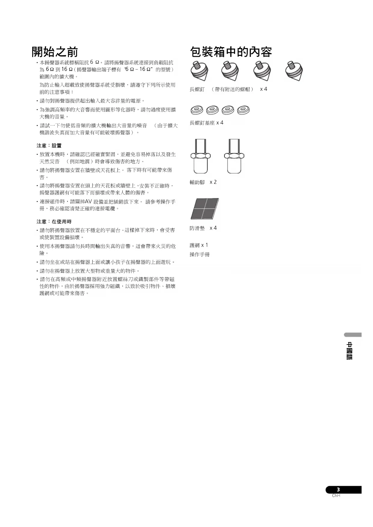 . ˙請勿把揚聲器放在陽光直接照射得到的地方,同時避免放置於電熱器和空調機的附近。 這樣說不定會引起揚聲器機箱變形 和變色以及損壞到揚聲器。˙日本先鋒公司對於部件的組裝,錯誤設置、加強不夠充分、誤用以及由自然行為所引起的故障,不負責一切損害的賠償責 任。
