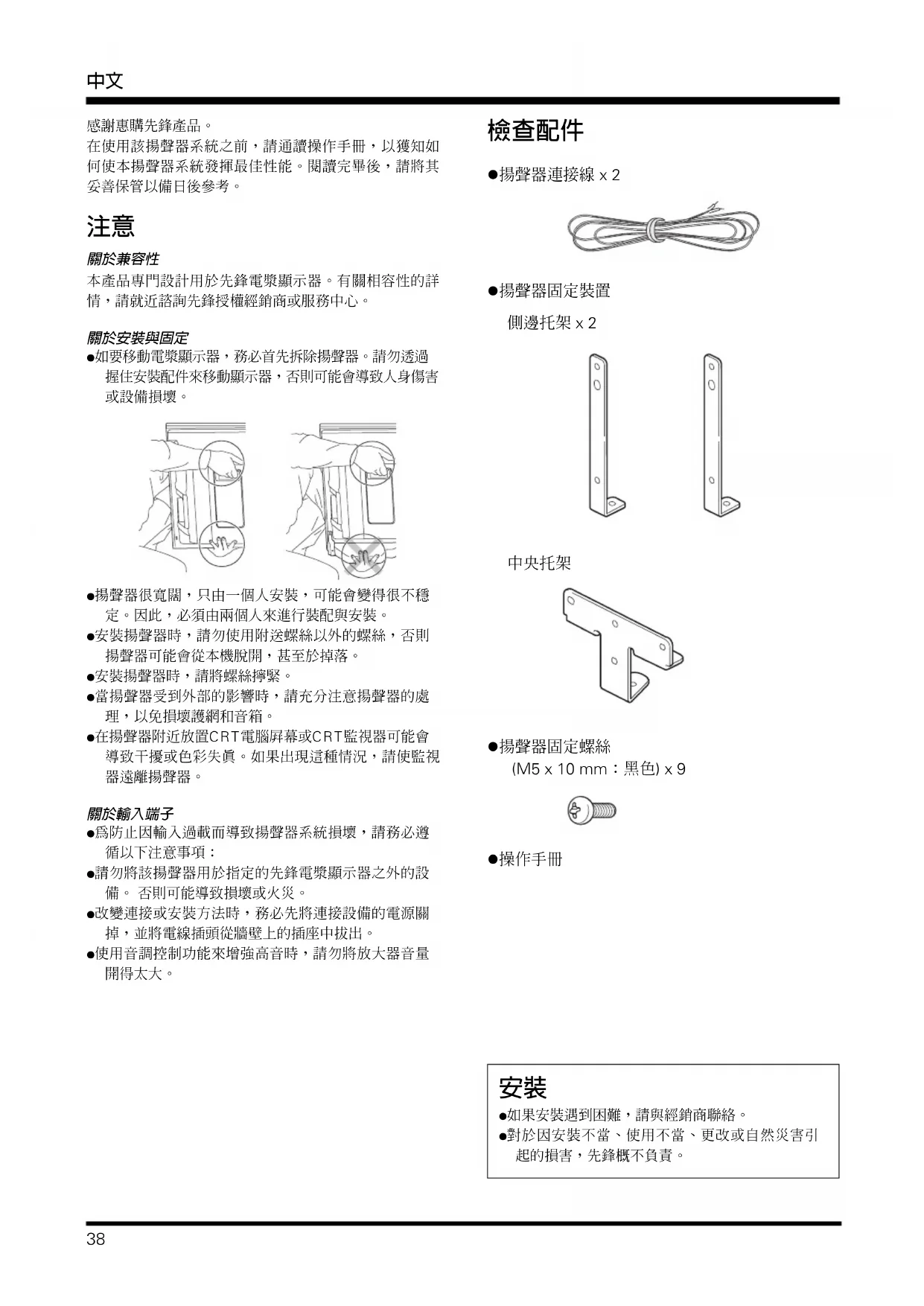 安裝 ÷ 如果安裝遇到困難,請與經銷商聯絡。÷ 對於因安裝不當、使用不當、更改或自然災害引起的損害,先鋒概不負責。感謝惠購先鋒產品。在使用該揚聲器系統之前,請通讀操作手冊,以獲知如何使本揚聲器系統發揮最佳性能。閱讀完畢後,請將其妥善保管以備日後參考。 注意 關於兼容性本產品專門設計用於先鋒電漿顯示器。有關相容性的詳情,請就近諮詢先鋒授權經銷商或服務中心。關於安裝與固定÷ 如要移動電漿顯示器,務必首先拆除揚聲器。請勿透過握住安裝配件來移動顯示器,否則可能會導致人身傷害或設備損壞。 檢查配件