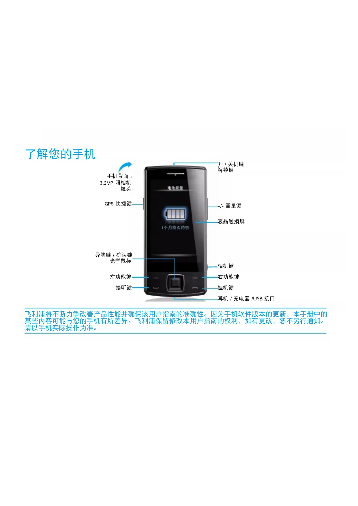 飞利浦将不断力争改善产品性能并确保该用户指南的准确性。因为手机软件版本的更新,本手册中的