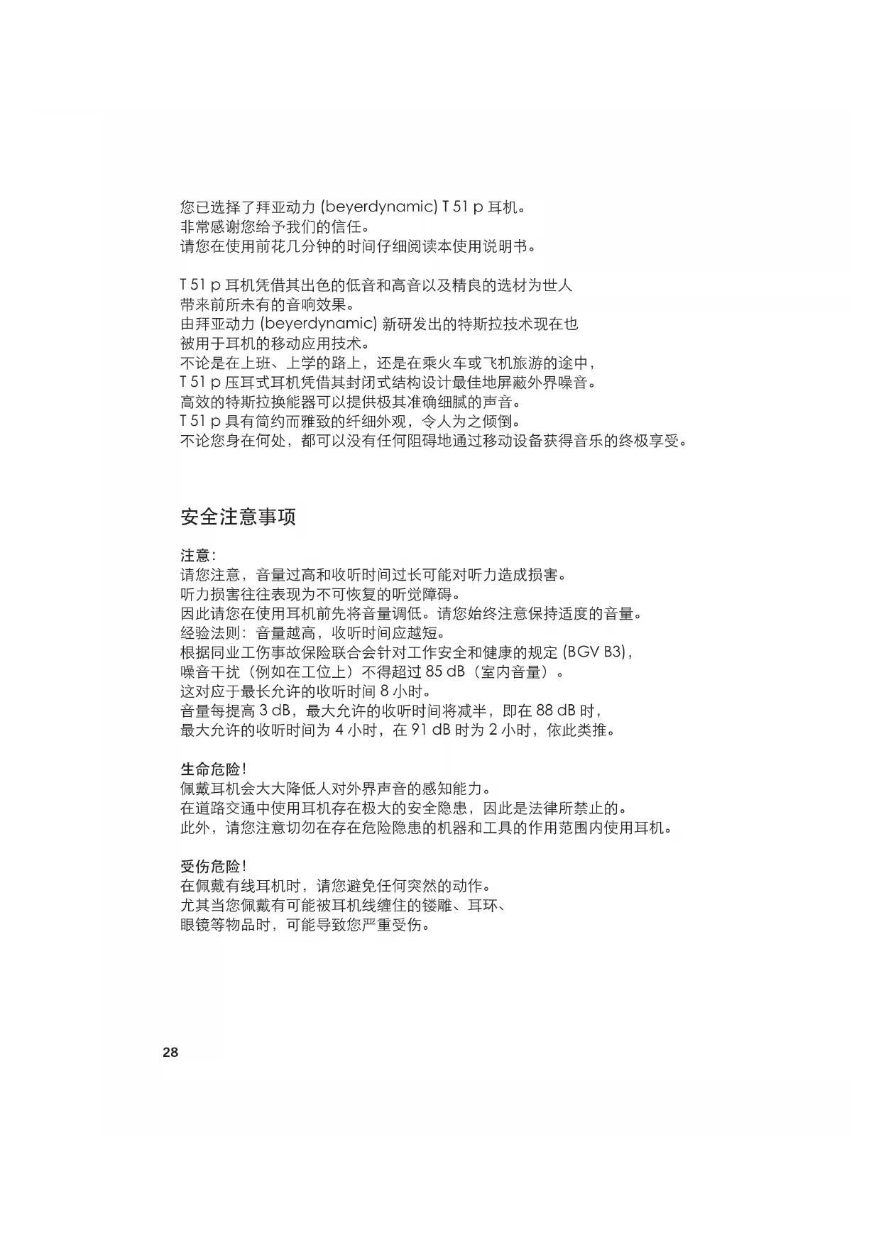 - 新しいイヤーパッドの保護フィル ムを取り外して、イヤーパッドを 取り付けます。28 您已选择了拜亚动力 (beyerdynamic) T 51 p 耳机。 非常感谢您给予我们的信任。 请您在使用前花几分钟的时间仔细阅读本使用说明书。 T 51 p 耳机凭借其出色的低音和高音以及精良的选材为世人 带来前所未有的音响效果。 由拜亚动力 (beyerdynamic) 新研发出的特斯拉技术现在也 被用于耳机的移动应用技术。 不论是在上班、上学的路上,还是在乘火车或飞机旅游的途中, T 51 p 压耳式耳机凭借其封闭式结构设计最佳地屏蔽外界噪音。 高效的特斯拉换能器可以提供极其准确细腻的声音。 T 51 p 具有简约而雅致的纤细外观,令人为之倾倒。 不论您身在何处,都可以没有任何阻碍地通过移动设备获得音乐的终极享受。