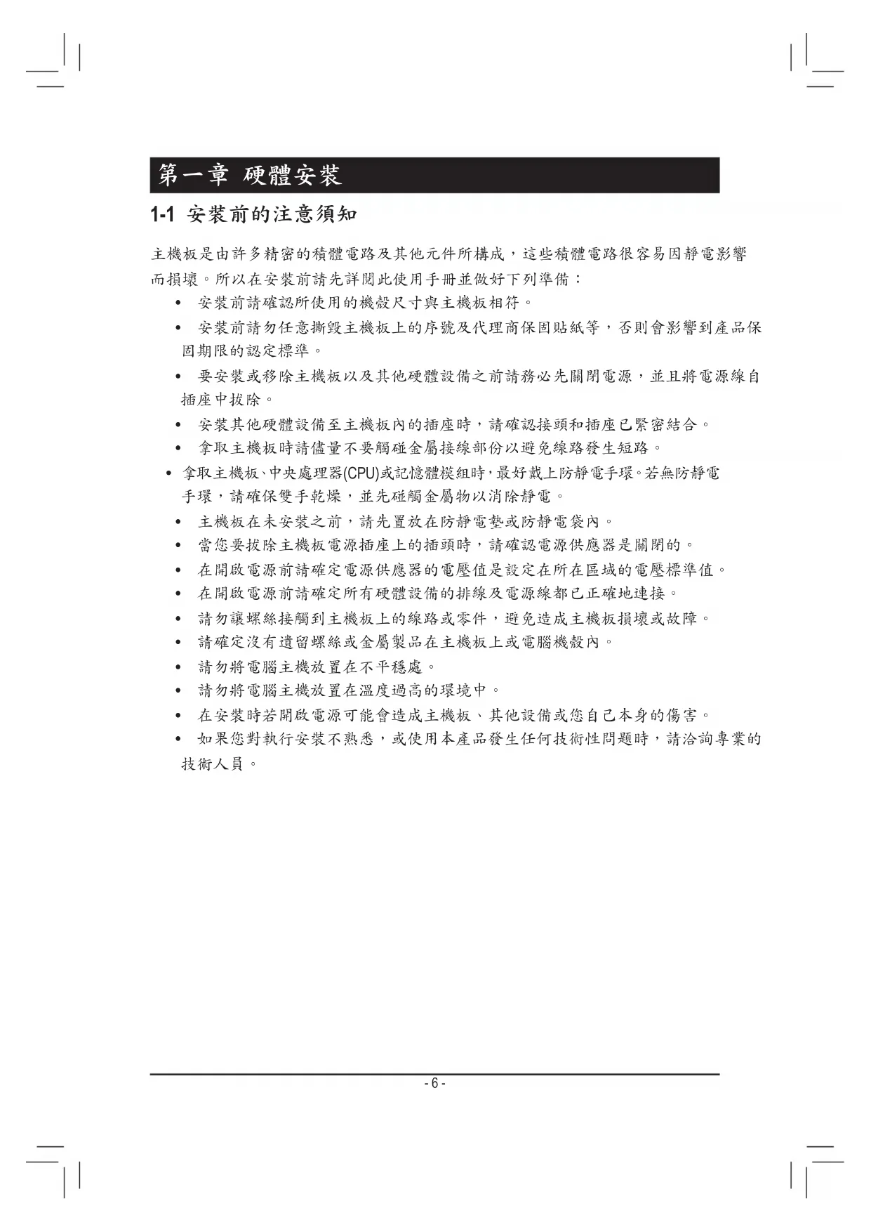• 要安裝或移除主機板以及其他硬體設備之前請務必先關閉電源,並且將電源線自