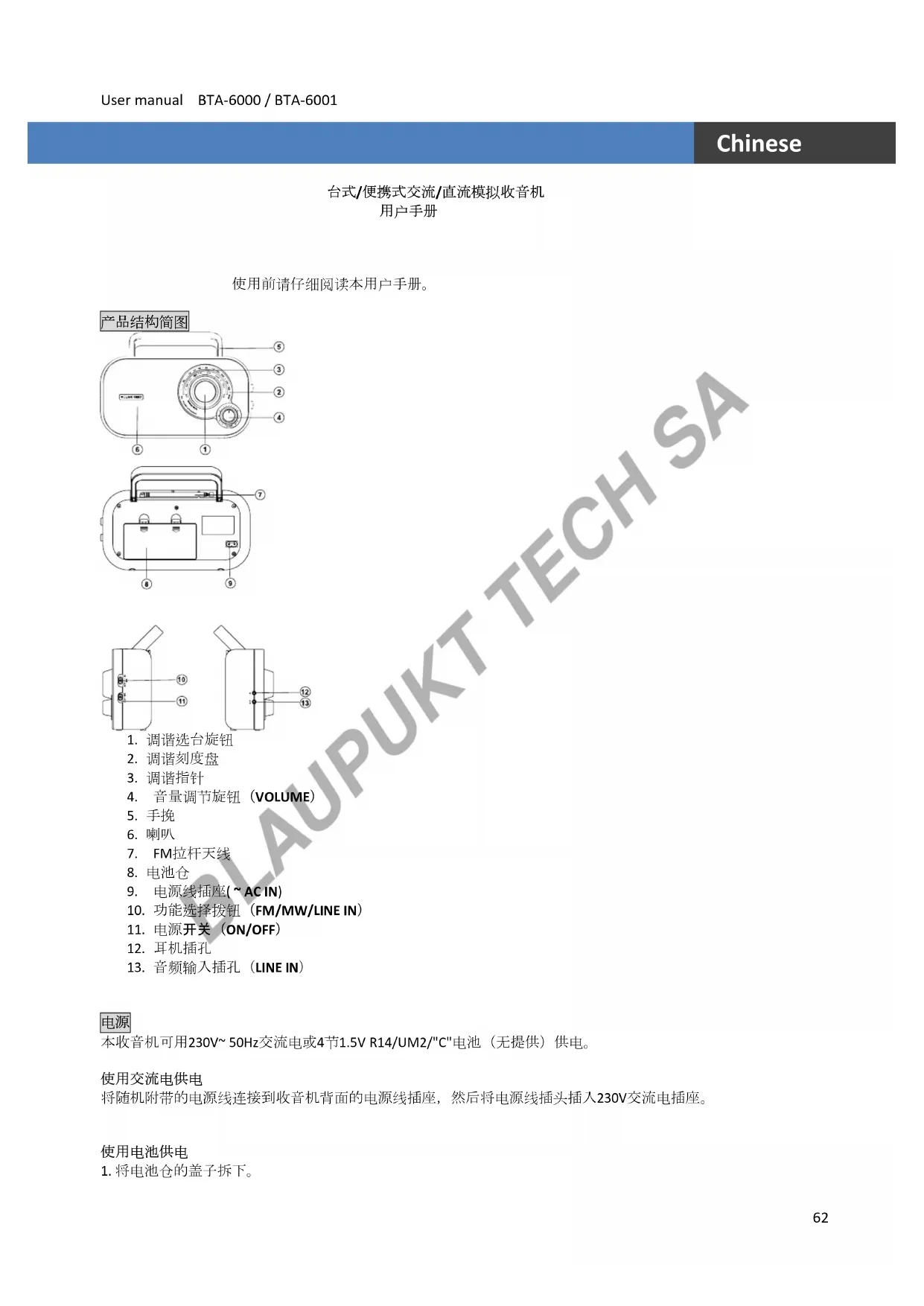 本收音机可用230V~ 50Hz交流电或4节1.5V R14/UM2/"C"电池(无提供)供电。