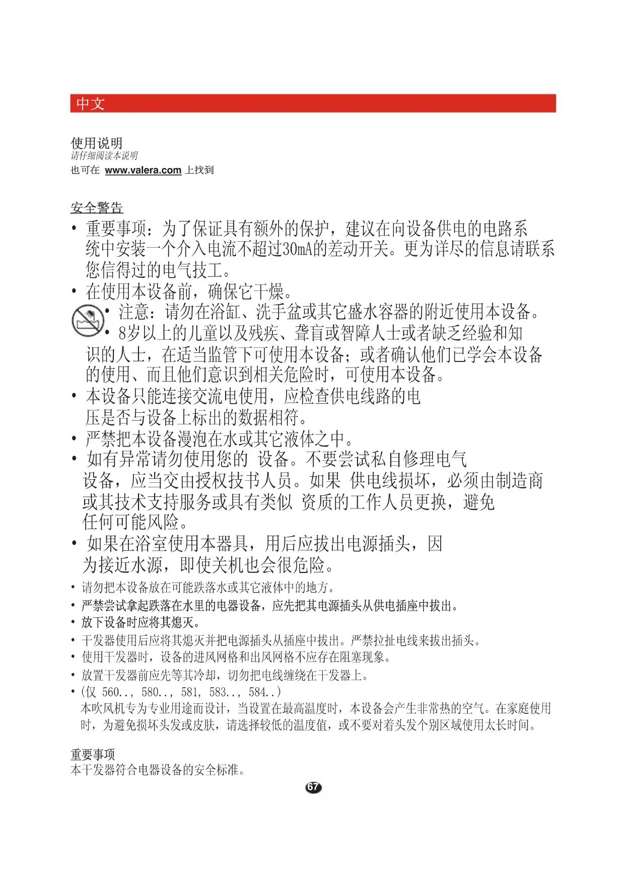 严禁把干发器浸没在水或任何其它液体之中!