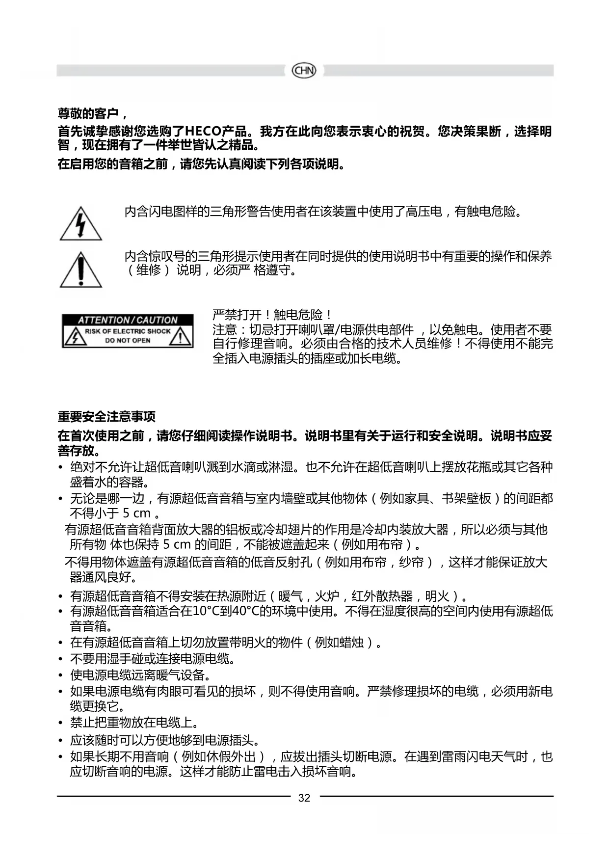 首先诚挚感谢您选购了HECO产品。我方在此向您表示衷心的祝贺。您决策果断,选择明 智,现在拥有了一件举世皆认之精品。 在启用您的音箱之前,请您先认真阅读下列各项说明。 内含闪电图样的三角形警告使用者在该装置中使用了高压电,有触电危险。 内含惊叹号的三角形提示使用者在同时提供的使用说明书中有重要的操作和保养 (维修) 说明,必须严 格遵守。