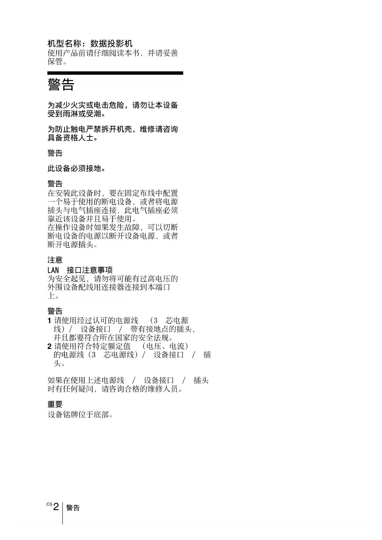 CS 检查随机附件 检查随机附件 RM-PJ8 遥控器 (1)锂电池 (CR2025) (1)已安装电池。使用遥控器前,请撕下 绝缘膜。 交流电源线 (1)迷你 D-sub 15 芯电缆 (1.8 米)(1)(1-970-584-11/Sony)镜头盖 (1)便携包 (1)快速参考手册 (本手册)(1)使用说明书 (CD-ROM) (1)Projector Station for Network Presentation 网络演示安装软件(CD-ROM) (1)USB 无线连接器 IFU-WLM3 (1)将附带的 CD-ROM 插入电脑的 CD-ROM 驱动器,片刻后 CD-ROM 会自动启动。选择想要阅读的使用说明书。如果 CD-ROM 没有自动启动,请打开 CD-ROM 中的“index.html”文件。电脑中必须安装有 Adobe Acrobat Reader 5.0 或更高版本才能阅读 CD-ROM中的使用说明书。 1 关闭所有正在运行的应用程序。