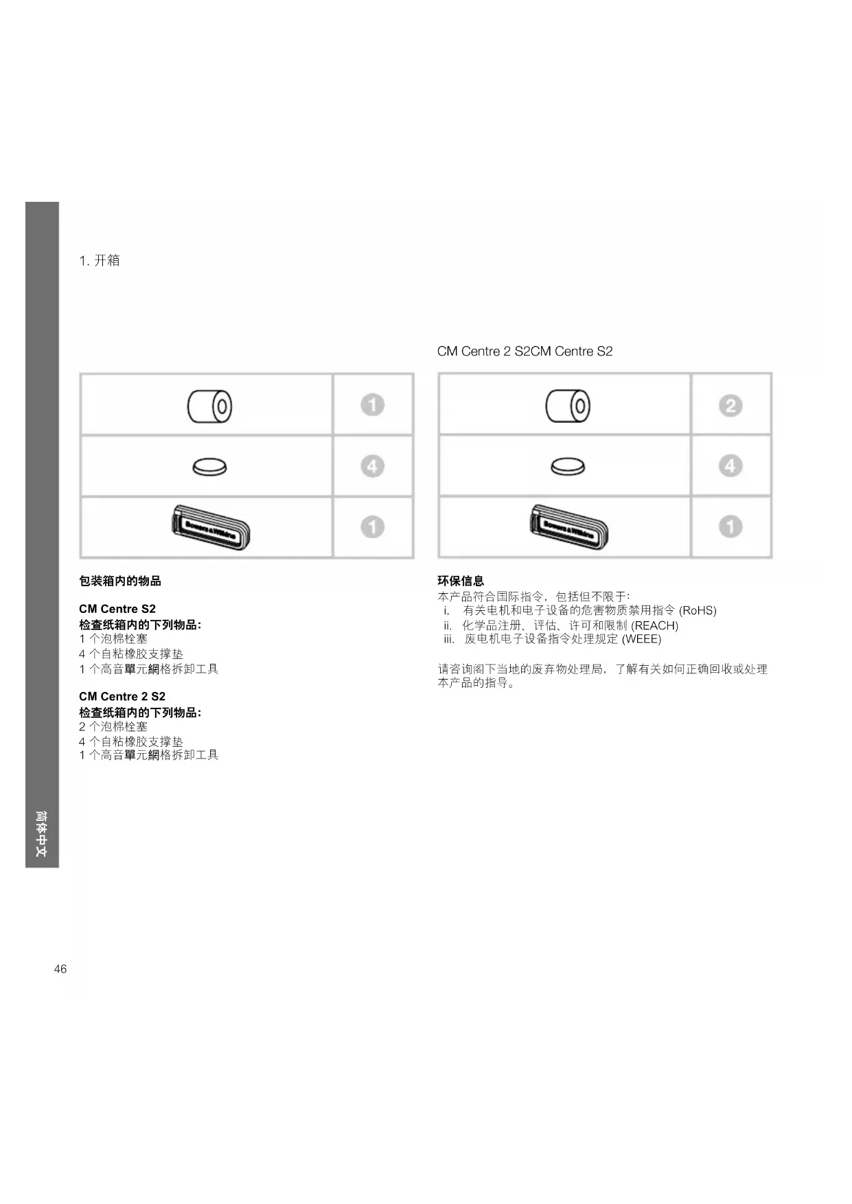 CM Centre S2 检查纸箱内的下列物品: 1 个泡棉栓塞 4 个自粘橡胶支撑垫 1 个高音單元網格拆卸工具 CM Centre 2 S2 检查纸箱内的下列物品: 2 个泡棉栓塞 4 个自粘橡胶支撑垫 1 个高音單元網格拆卸工具