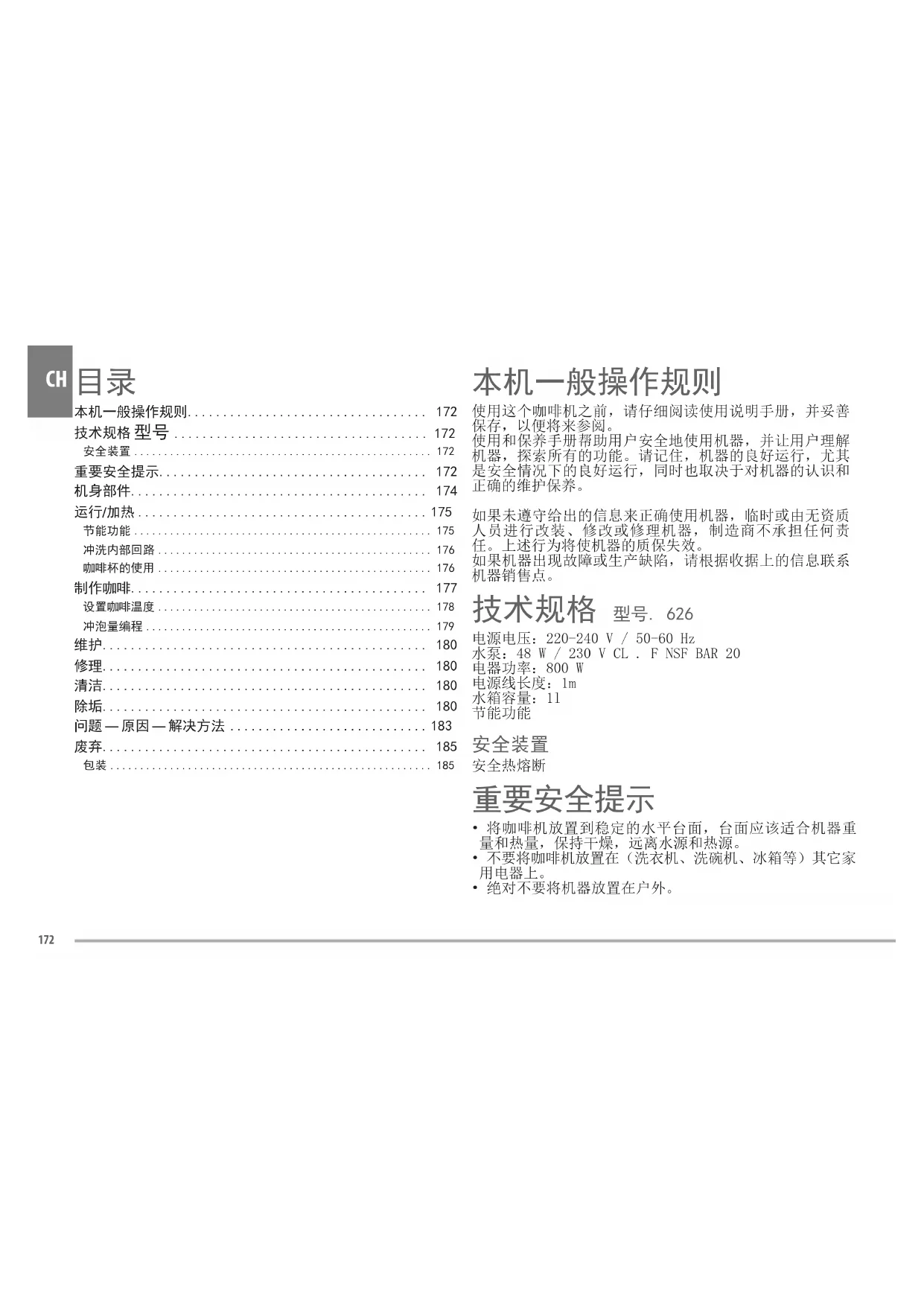 目录 本机一般操作规则 172技术规格 型号 172 安全装置 172重要安全提示 172机身部件 174 运行/加热 175 节能功能 175冲洗内部回路 176咖啡杯的使用 176制作咖啡 177设置咖啡温度 178冲泡量编程 179维护 180修理 180清洁 180除垢 180 问题 — 原因 — 解决方法 183 废弃 185包装 185173