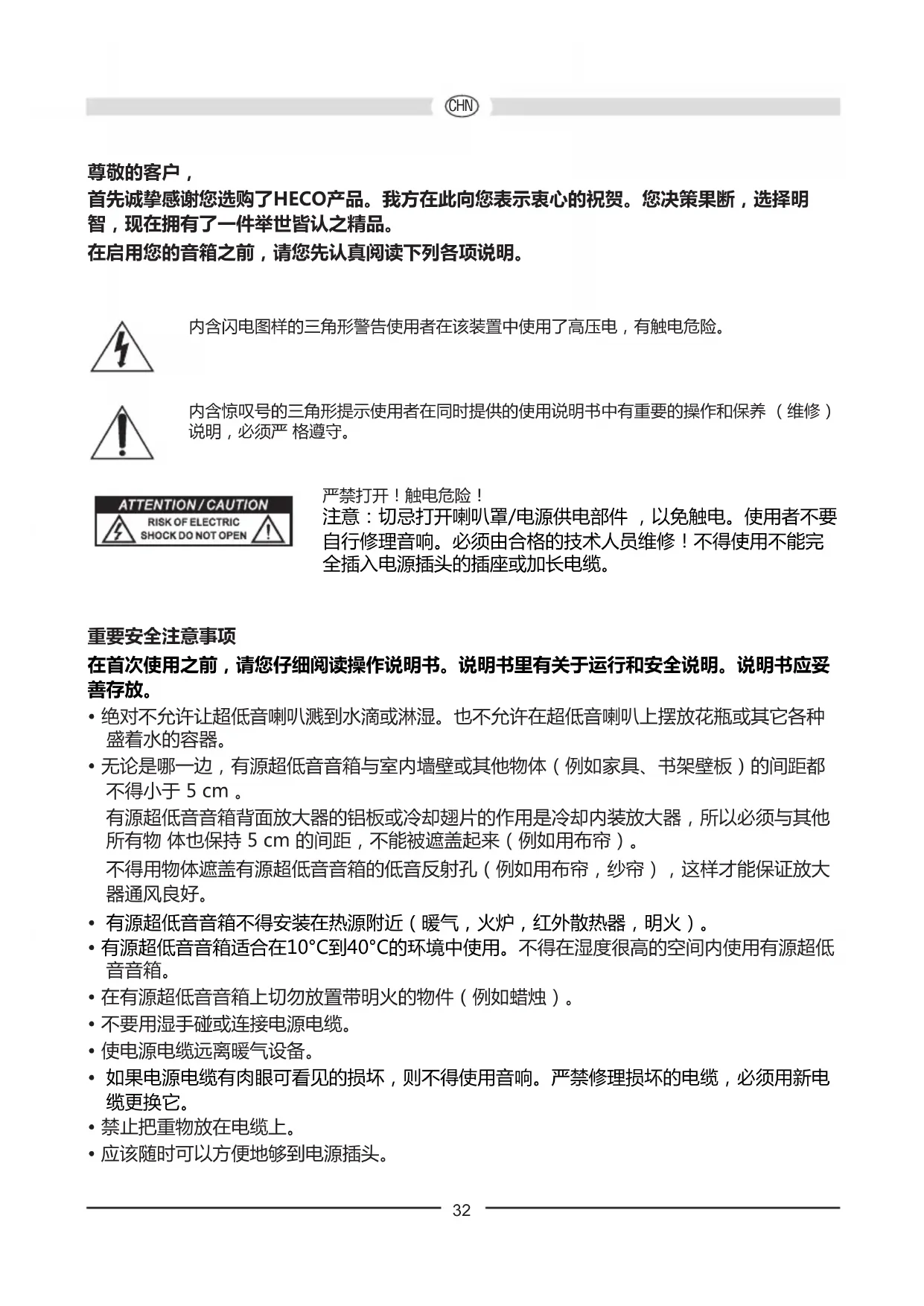 首先诚挚感谢您选购了HECO产品。我方在此向您表示衷心的祝贺。您决策果断,选择明 智,现在拥有了一件举世皆认之精品。 在启用您的音箱之前,请您先认真阅读下列各项说明。 内含闪电图样的三角形警告使用者在该装置中使用了高压电,有触电危险。 内含惊叹号的三角形提示使用者在同时提供的使用说明书中有重要的操作和保养 (维修) 说明,必须严 格遵守。