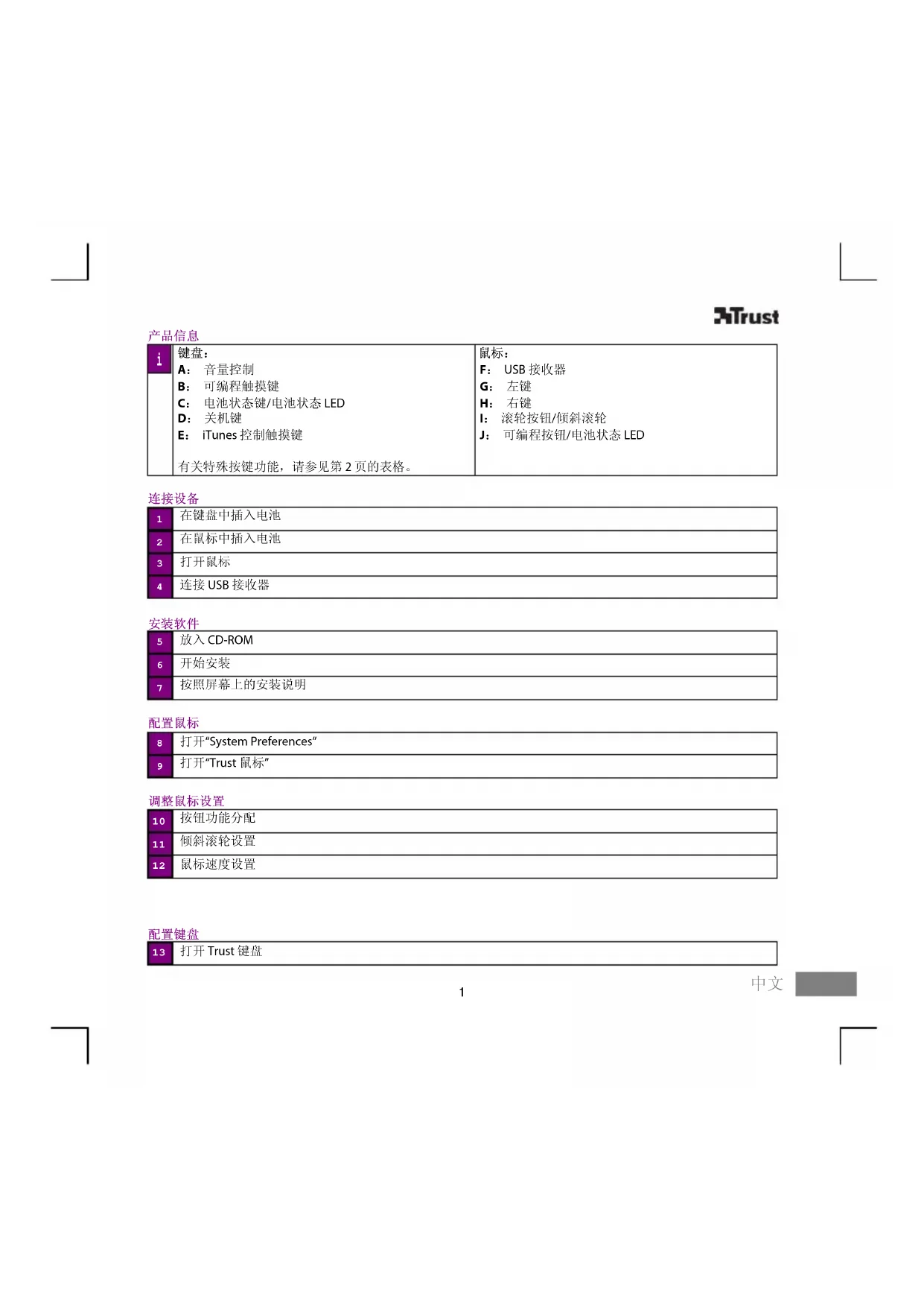 故障排除: 请参见 www.trust.com/15907 了解最新的常见问题解答、驱动程序和说明手册。 有关更多服务,请转至 www.trust.com/register 进行注册。 安全说明: 在使用之前,请阅读位于 www.trust.com/safety 的安全说明。 请仅按照用户指南中的说明使用该设备。 除非另外注明,否则设备应供家庭或办公室使用. 不要打开或修理该设备。 请勿在潮湿的环境中使用本设备。 请使用干布清洁本设备。 CE: 本设备符合欧洲指令的基本要求和其他相关条件。 合格证明 (DoC) 可通过 www.trust.com/15907/manuals