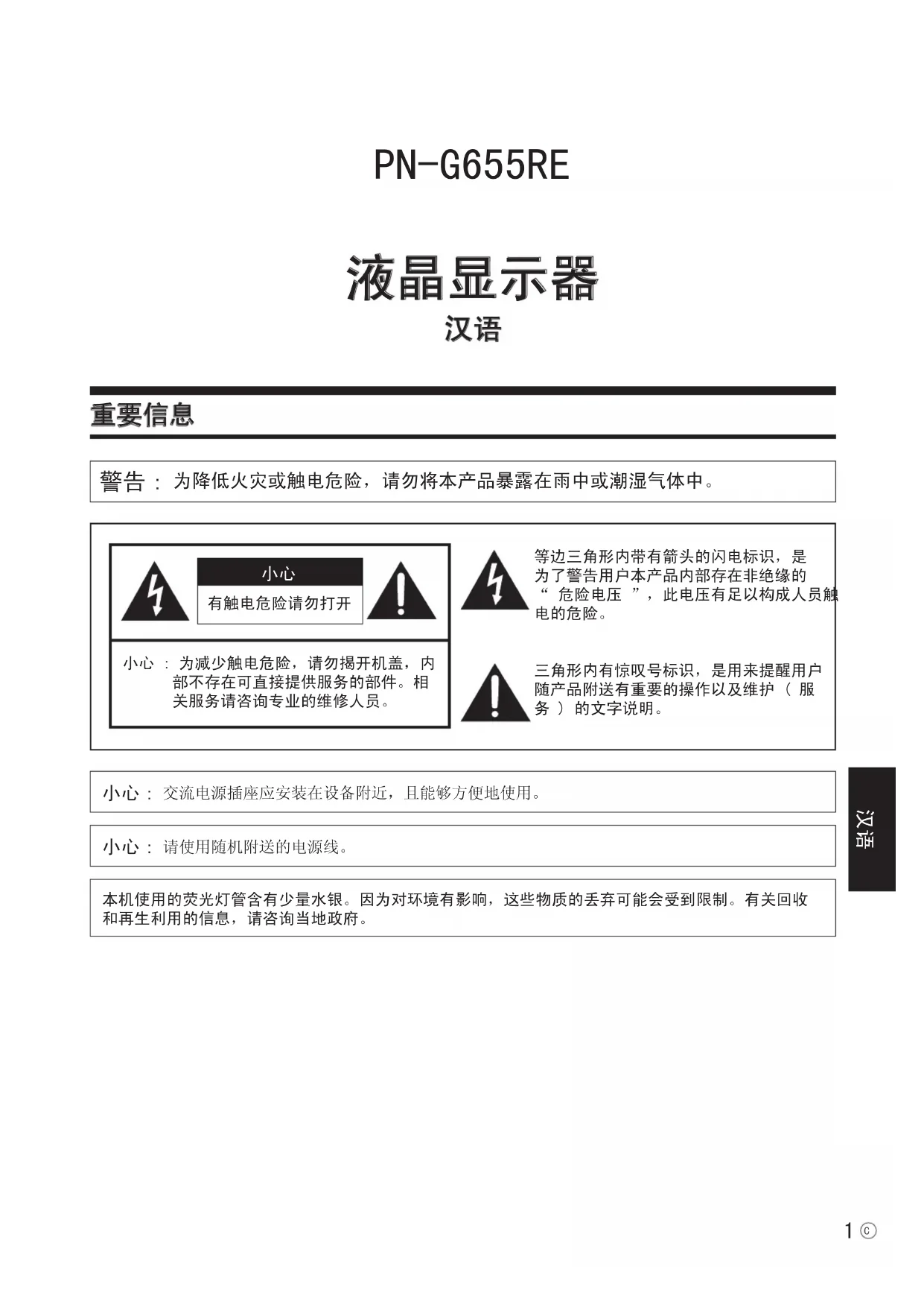 为降低火灾或触电危险,请勿将本产品暴露在雨中或潮湿气体中。有触电危险请勿打开 小心 : 为减少触电危险,请勿揭开机盖,内部不存在可直接提供服务的部件。相关服务请咨询专业的维修人员。等边三角形内带有箭头的闪电标识,是为了警告用户本产品内部存在非绝缘的“ 危险电压 ”,此电压有足以构成人员触电的危险。三角形内有惊叹号标识,是用来提醒用户随产品附送有重要的操作以及维护 ( 服务 ) 的文字说明。 交流电源插座应安装在设备附近,且能够方便地使用。本机使用的荧光灯管含有少量水银。因为对环境有影响,这些物质的丢弃可能会受到限制。有关回收和再生利用的信息,请咨询当地政府。 请使用随机附送的电源线。2