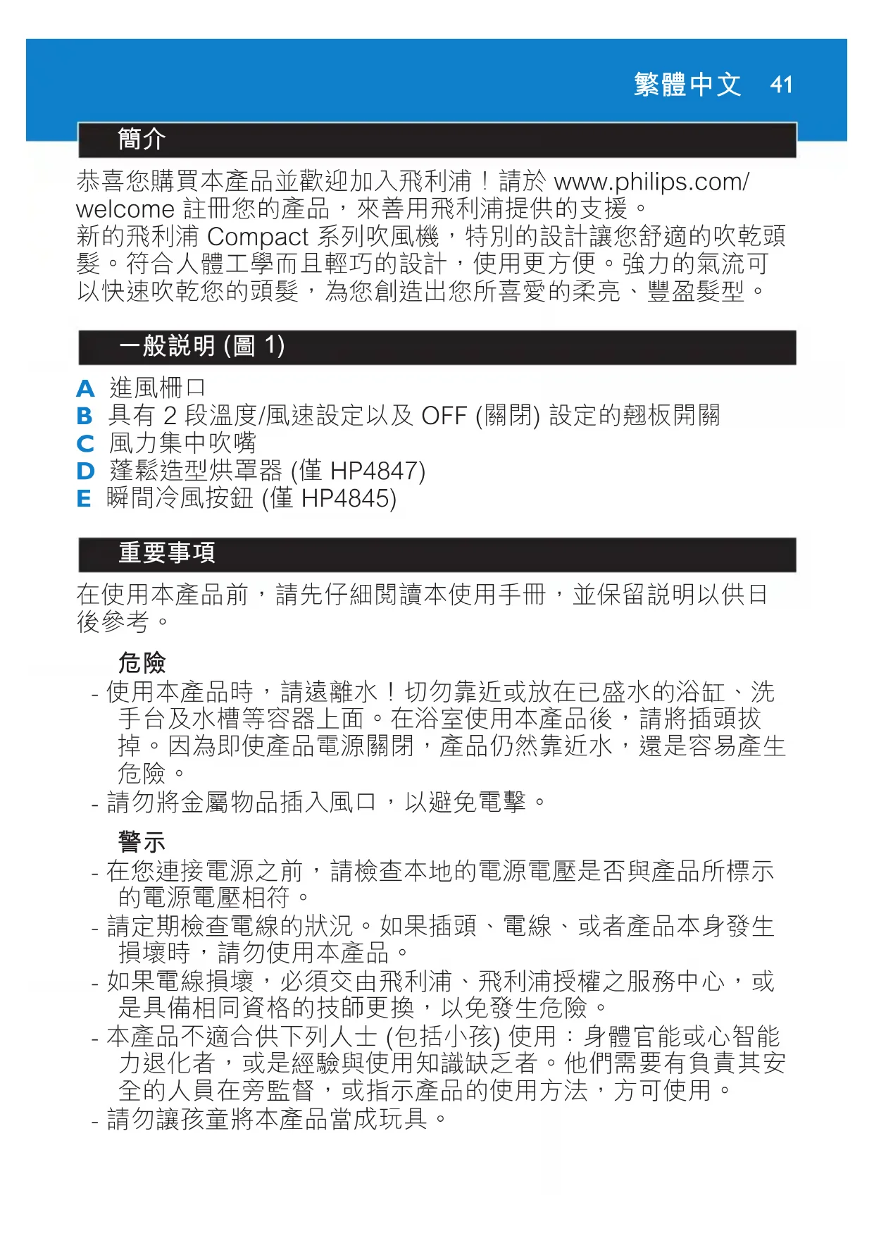 Compact HP4841 - 吹风机 PHILIPS - 免费用户手册