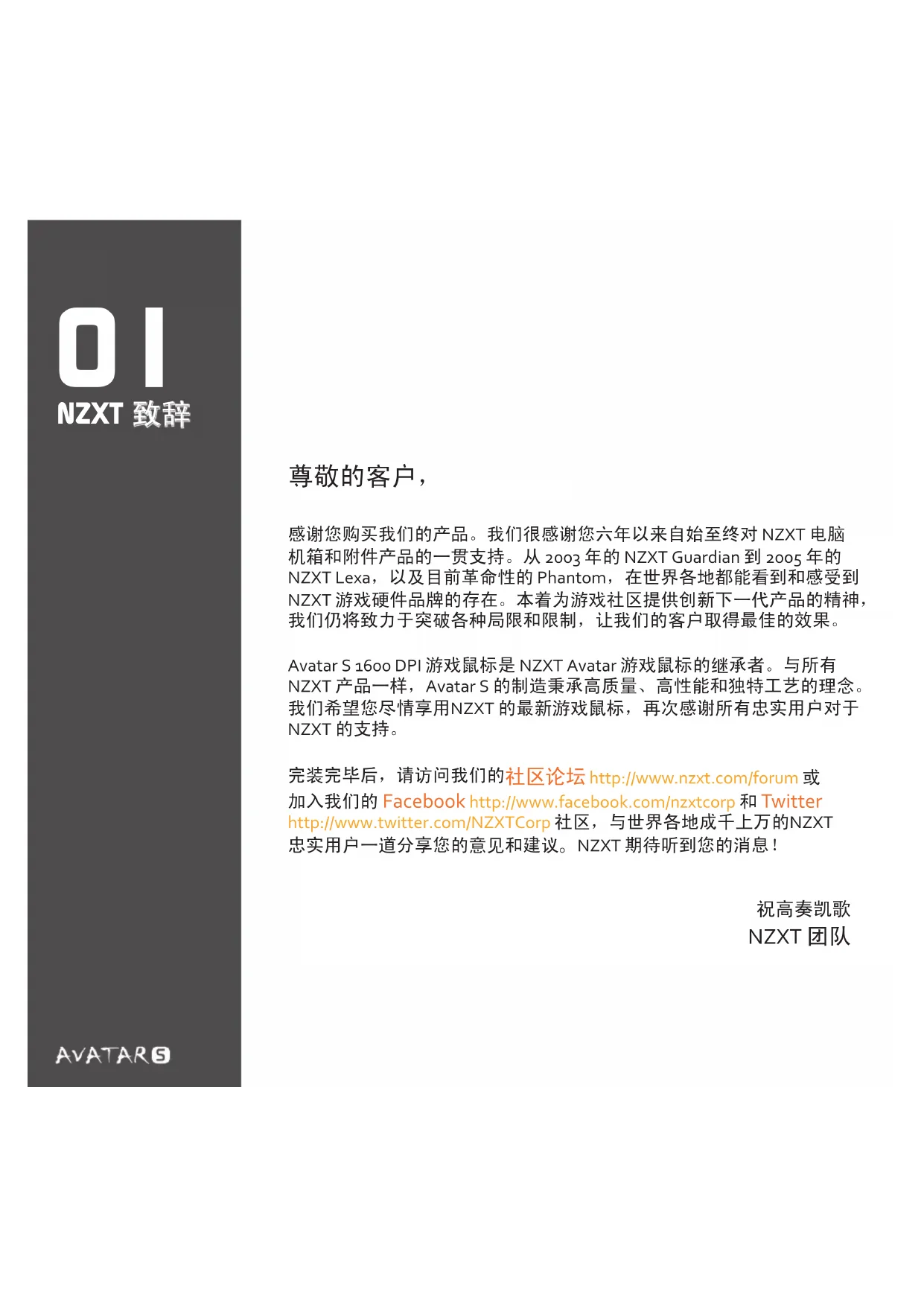 NZXT 团队 NZXT 致辞 感谢您购买我们的产品。我们很感谢您六年以来自始至终对 NZXT 电脑 机箱和附件产品的一贯支持。从 2003 年的 NZXT Guardian 到 2005 年的 NZXT Lexa,以及目前革命性的 Phantom,在世界各地都能看到和感受到 NZXT 游戏硬件品牌的存在。本着为游戏社区提供创新下一代产品的精神,我们仍将致力于突破各种局限和限制,让我们的客户取得最佳的效果。Avatar S 1600 DPI 游戏鼠标是 NZXT Avatar 游戏鼠标的继承者。与所有NZXT 产品一样,Avatar S 的制造秉承高质量、高性能和独特工艺的理念。我们希望您尽情享用NZXT 的最新游戏鼠标,再次感谢所有忠实用户对于 NZXT 的支持。完装完毕后,请访问我们的 社区论坛 http://www.nzxt.com/forum 或 Facebook http://www.facebook.com/nzxtcorp 和 Twitter http://www.twitter.com/NZXTCorp 社区,与世界各地成千上万的NZXT 忠实用户一道分享您的意见和建议。NZXT 期待听到您的消息!02